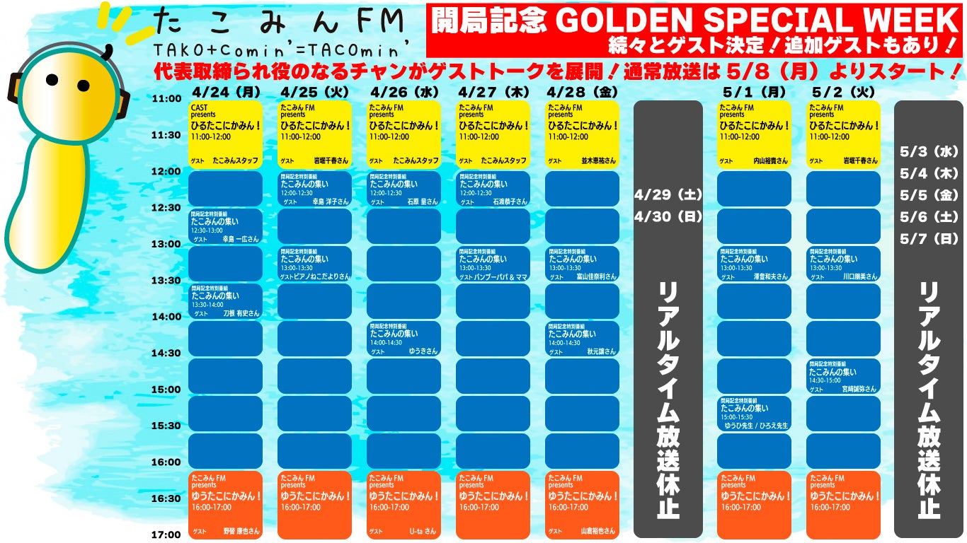 たくさんの応援をいただいたたこみんFMが、ついに本日開局しました放送初日、ゲストをお迎えして11時から17時まで喋り通しました!これから5/2までの平日は開局記念番組として、さまざまな方をゲストにお迎えしてトークを展開していきます。通常放送は5/8から、クラウドファンディングの支援で番組枠を選択していただいた皆さんに担当していただく番組の放送が始まります!聴き逃し配信はYouTubeとpodcastでいつでも聴けます。田舎で起業!本当にできるの?このプロジェクト、僕の勝手な企画で「田舎で起業!本当にできるの?」というYouTubeのプロジェクトが始まりです。2023年4月に千葉県多古町の地域に根ざした事業をオープンすることを目標に、3つの条件を設けてスタートしました。3つの条件とは、・株式会社CASTとは別の新事業とする・多古町の方々の力をお借りする・資金ゼロからスタートこの条件をもとに、たくさんの意見を聞いた結果、「仲良くなるきっかけが欲しい」という需要を導き出し、ラジオという手段を使って交流をたくさん生む場所を作ることを決断。それが、1月。そこから4月のスタートに向けて急いで準備を進めて、ひとまず、無事に本日開局できました。決める!行動する!継続する!この3つを続けるだけで、想像を現実にすることができるんだと本当に実感した1日でした。ここからは、とにかく長く続けることを目標に、できることを1つずつクリアして前進していきます。たくさんの応援、ありがとうございます。たこみんFMは、みんなの声でできたラジオ局です。ぜひ皆さんで一緒に盛り上げていきましょう!
