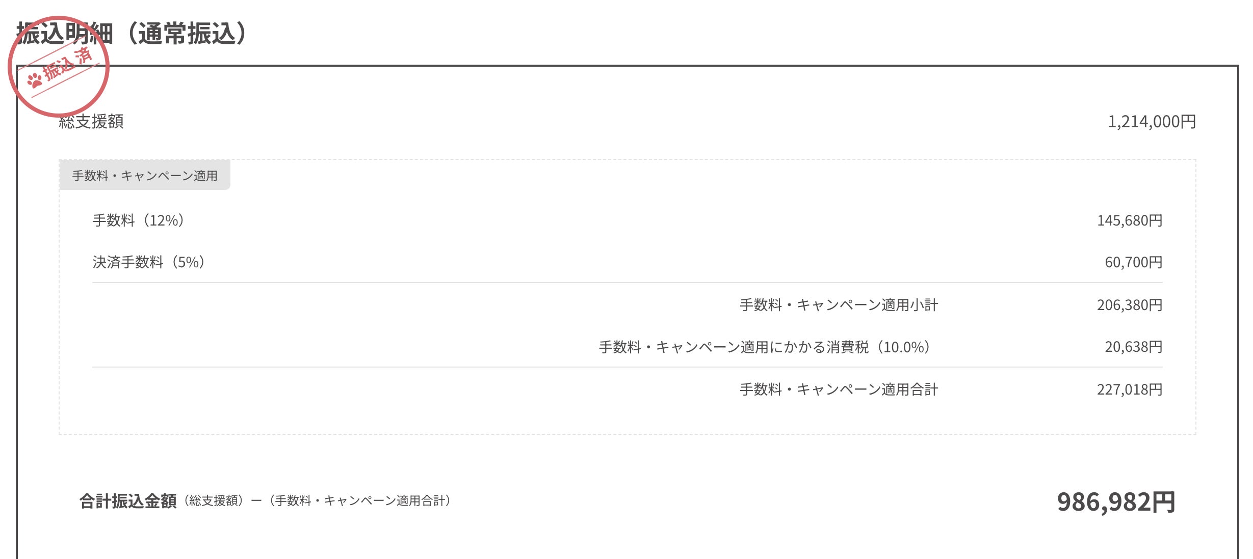 クラウドファンディングのプラットフォーム「CAMPFIRE」の手数料を差し引き、986,982円の入金を5月31日に確認いたしました。