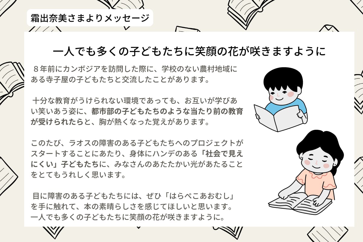 このたび、ラオスの障害のある子どもたちへのプロジェクトがスタートすることにあたり、身体にハンデのある「社会で見えにくい」子どもたちに、みなさんのあたたかい光があたることをとてもうれしく思います。