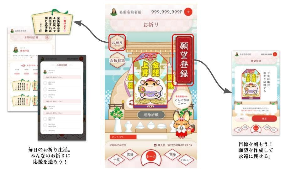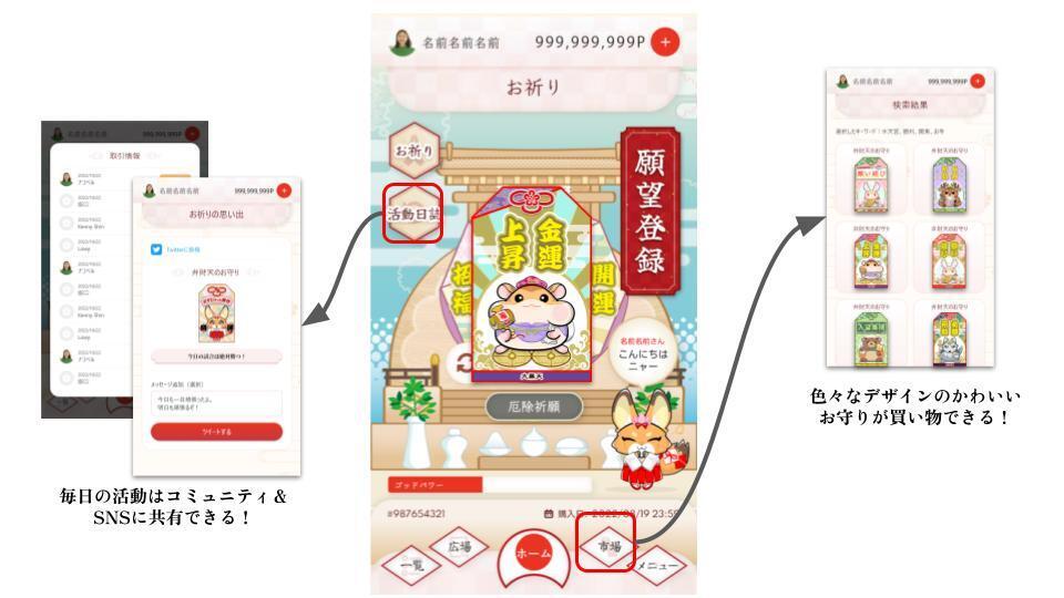 A. 神社、またはお寺に行かなくても自分のお守りに祈ることができます。そして自分の祈りが永遠に残ります。なくしても活動した履歴が残ったまま復旧できます。他にも、マンダラートなど願いを叶えるのに役にたつ機能が続々追加されていきます。