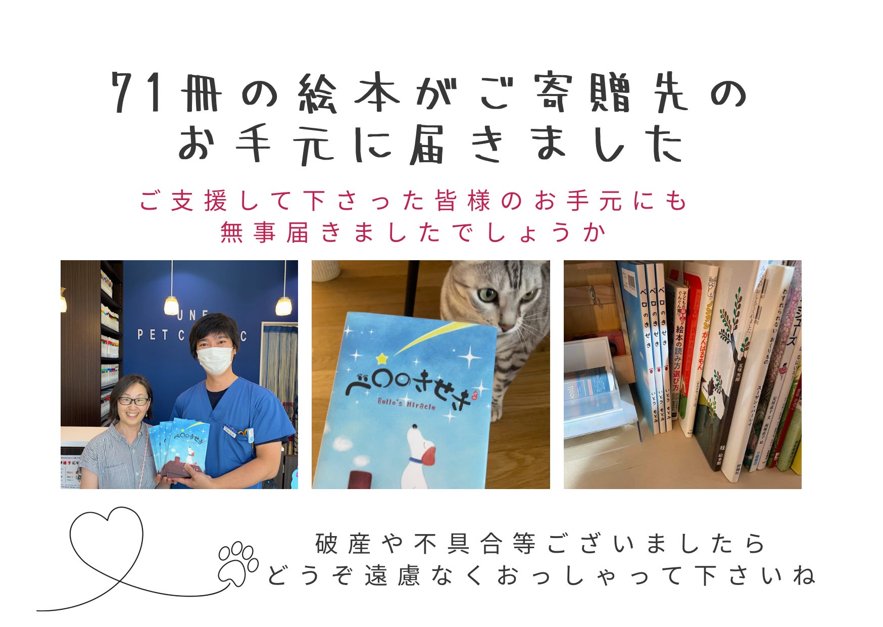 皆様、こんばんは日本海へ抜けたとはいえゆっくりで勢力が大きい台風7号。皆様ご無事でしょうか?油断せず、注意してくださいね。さて、本日絵本ご寄贈先の皆様の確認が全て取れましたのでご報告させて頂きます。(ご寄贈先の画像の一部↓)・動物愛護団体 NPO法人DOG DUCA様(愛知県名古屋市)・保護猫かふぇ リアン様(兵庫県尼崎市)・大人のための絵本屋 socoli様(東京都調布市)・うね動物病院様(兵庫県明石市)・さくら保育所様(兵庫県三田市)・図書ボランティアあのね様(長崎県諫早市)・aroma yoga ヒノベリー様(長崎県諫早市)・癒心体 パトマ様(兵庫県西宮市)・加古川Cat protection心誠様(兵庫県加古川市)・ヘアサロン cure様(兵庫県 明石市)・ペットショップ モンチビ様(兵庫県 明石市・アルマ動物病院様(兵庫県 明石市)改めてまして、寄贈コースにご支援下さった皆様、ありがとうございましたm(__)mまた他のコースにご支援下さった皆様。無事お手元にリターンが届きましたでしょうか?届いていない・破損があった等何かごさいましたら遠慮なく仰って下さいませ。人と動物が共に幸せに暮らせる世界になります様に(^人^)伊藤元美