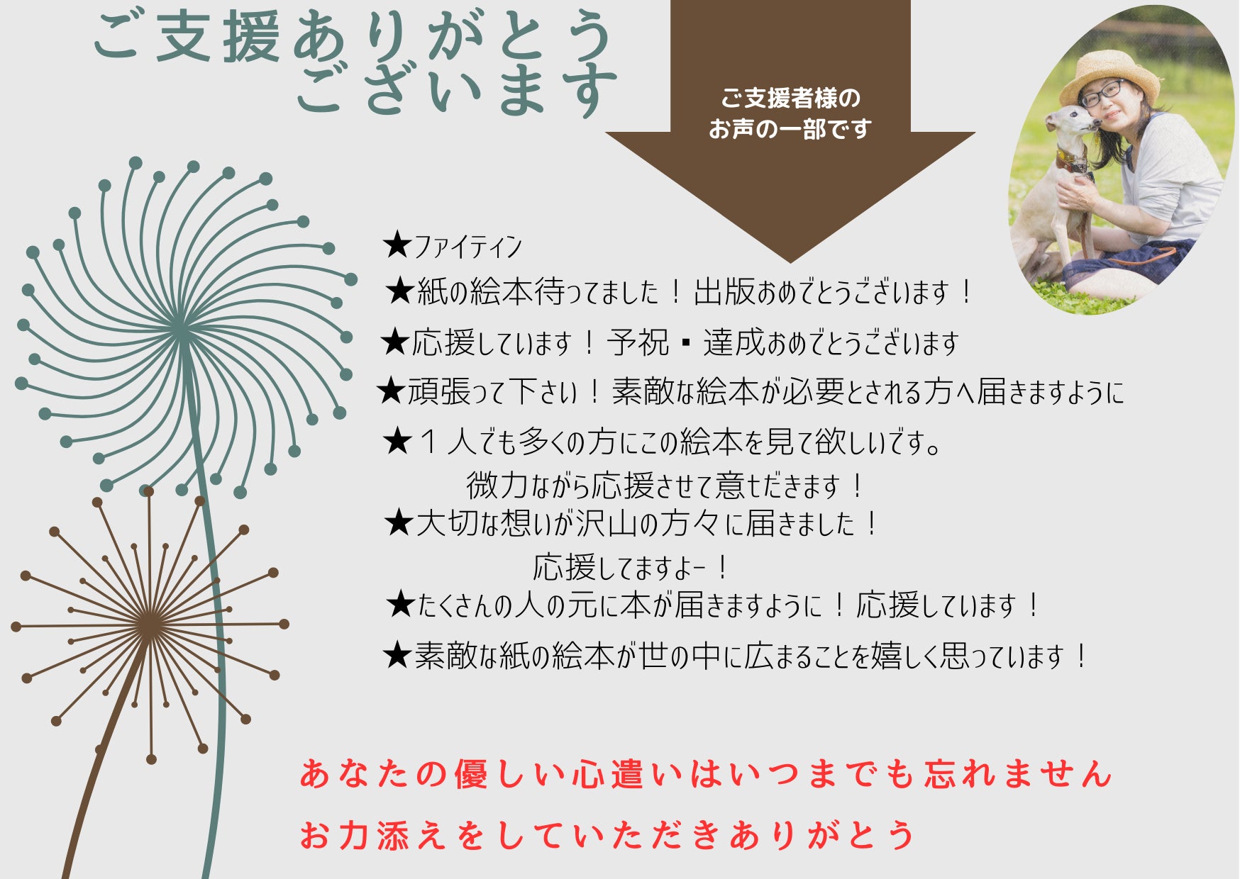 ご支援者様から心温まる応援メッセージを頂き、5/21までの公開で達成出来るか、無謀な挑戦では?と不安になっていた気持ちが払拭され力強く私の支えとなっております。