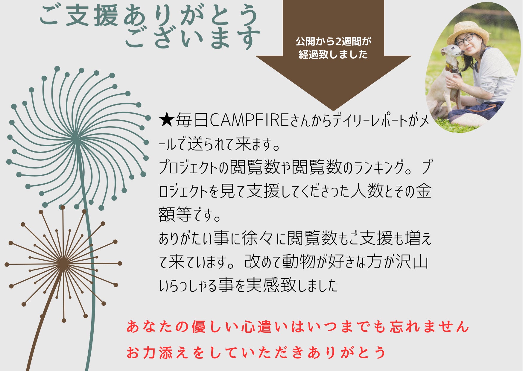 支援してくださった方々に、心から感謝しています。今後も、1人でも多く方にこの絵本をお届けできる様に努め、皆様にも喜んでいただける報告が出来ると信じております。