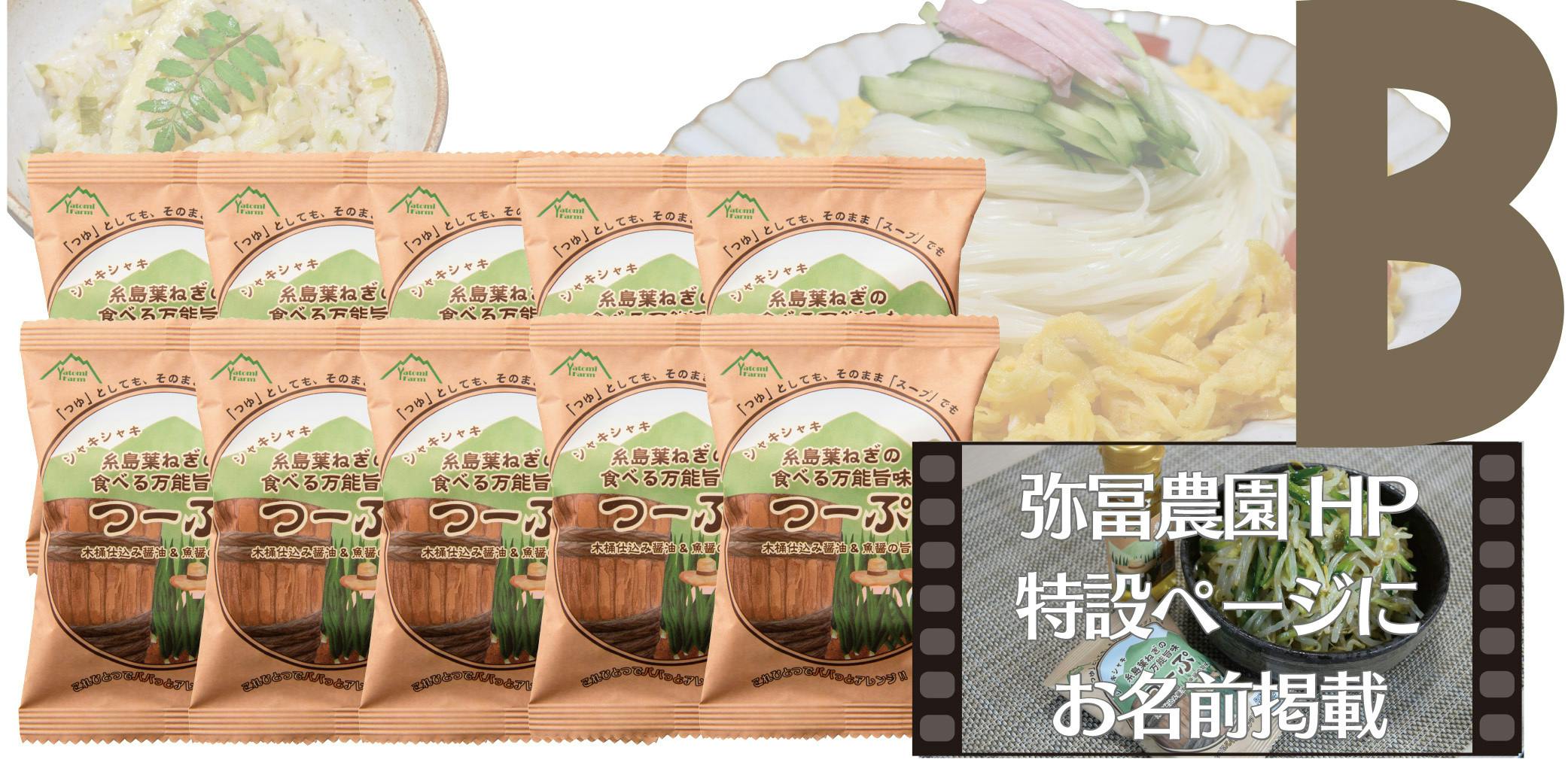 「糸島葉ねぎの食べる万能旨味つーぷ」弥冨農園特設HPにお名前掲載&糸島ねぎ農家セット E 10000円(税込)