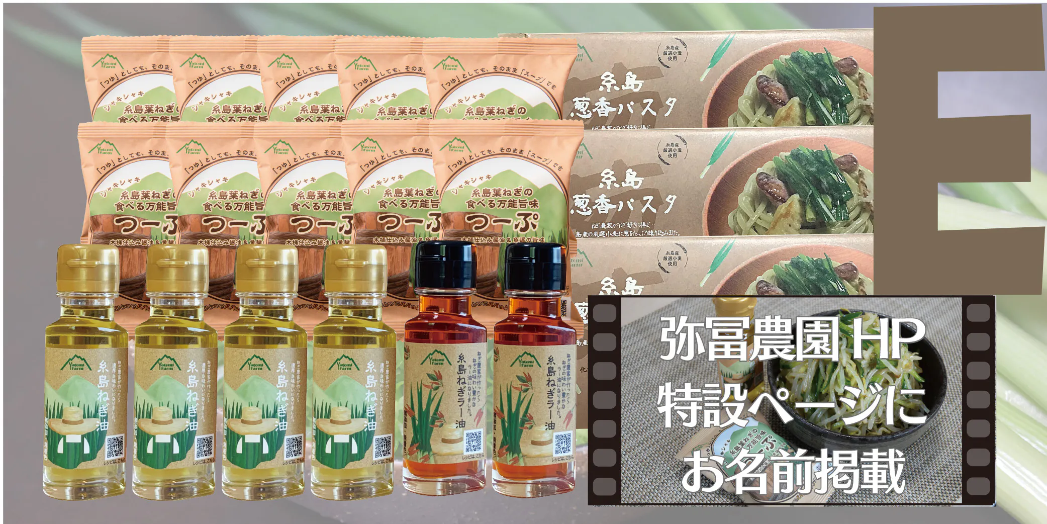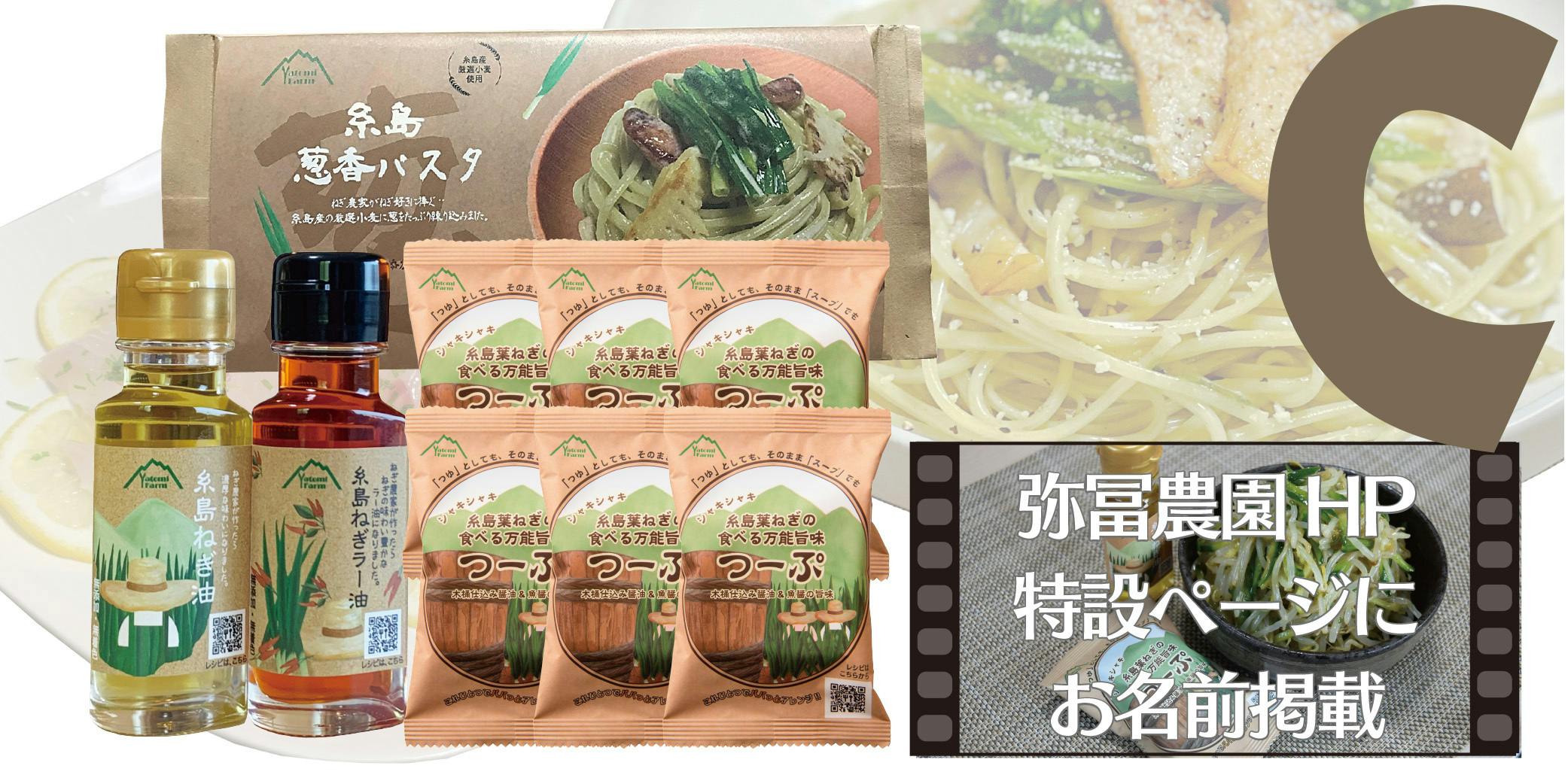 【内容】①糸島ねぎ油47g 1本 ②糸島ねぎラー油47g 1本 ③つーぷ 6袋 ④糸島葱香パスタ350g 1袋 ⑤弥冨農園の特設ページにお名前を掲載します