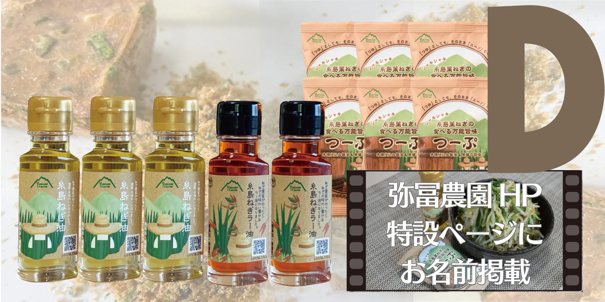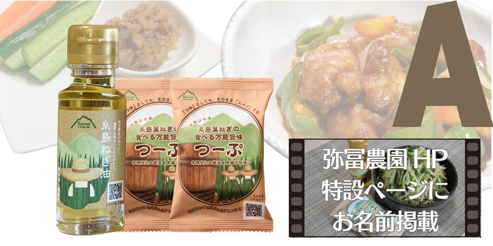 【内容】①糸島ねぎ油47g 3本 ②糸島ねぎラー油 2本 ③つーぷ 6袋 ④弥冨農園の特設ページにお名前を掲載します