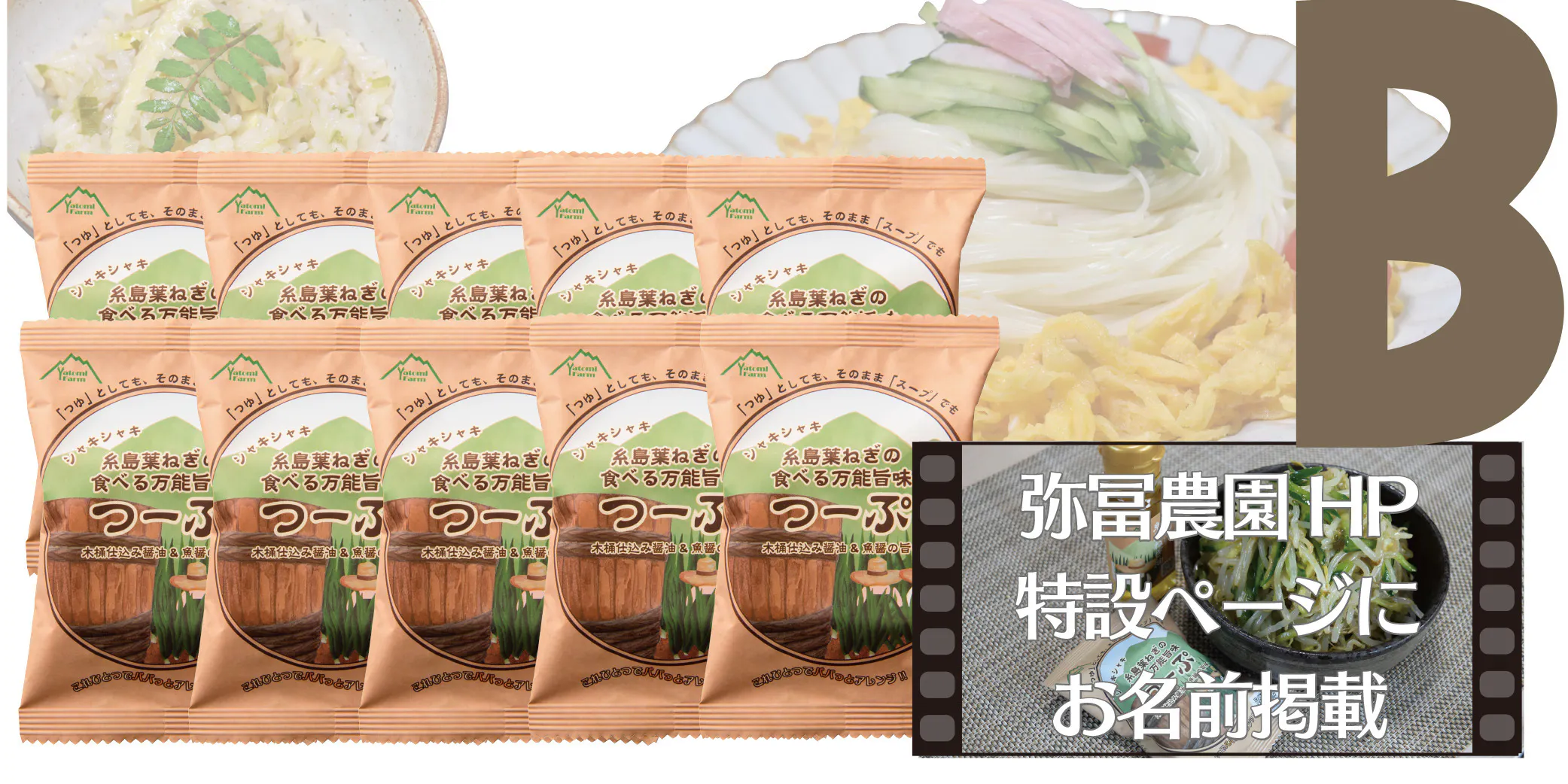 「糸島葉ねぎの食べる万能旨味つーぷ」弥冨農園特設HPにお名前掲載&糸島ねぎ農家セット B 3000円(税込)
