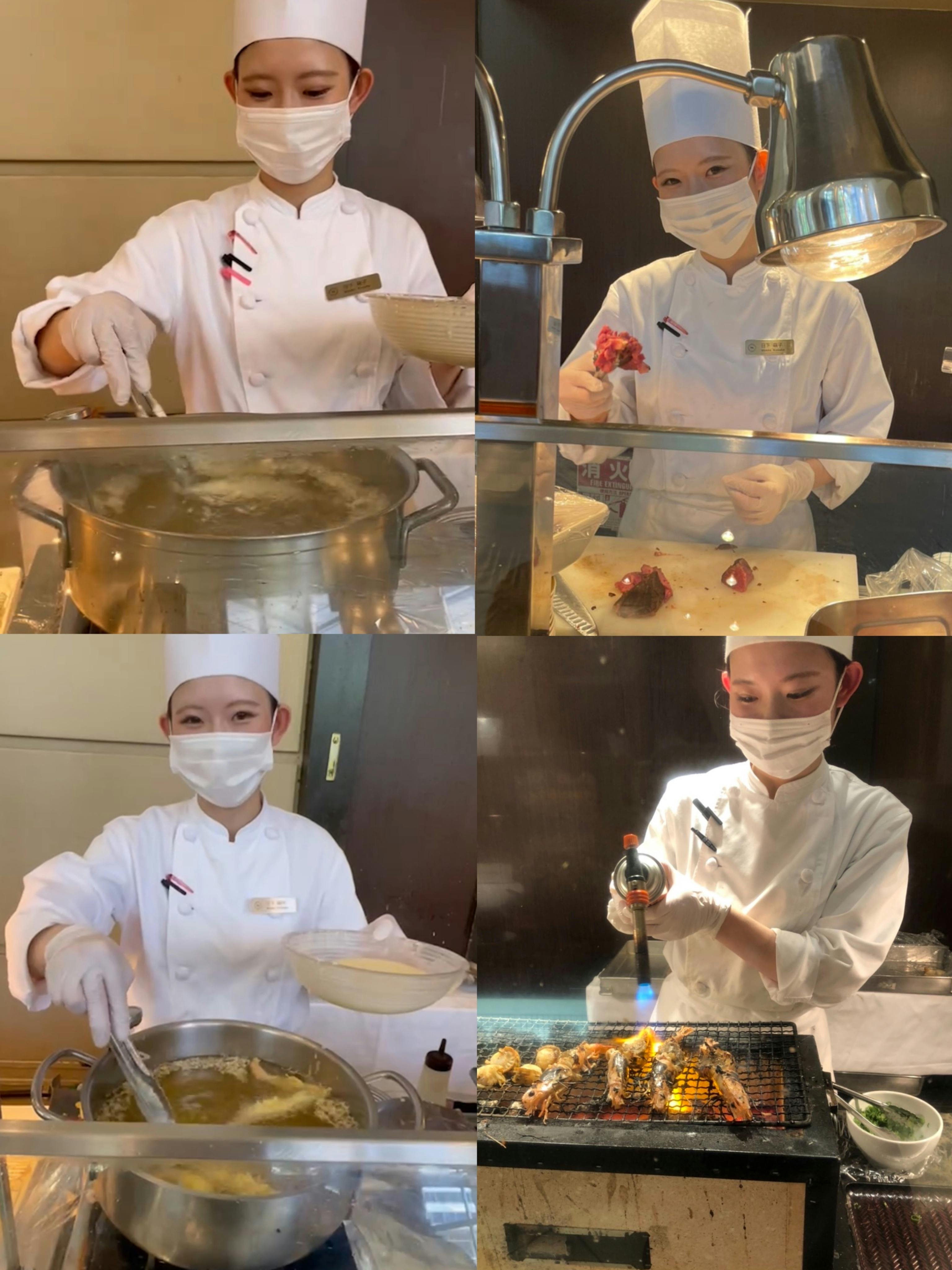 私は料理に力を入れるために、神戸のホテルで料理の修行をしました。魚をおろしたり、天ぷらを揚げたり、見たことのない食材に触れたり、料理を綺麗に盛り付ける技術や接客も含め、たくさんのことを学ぶことができました。そして念願であった調理師免許も取得することが出来ました。