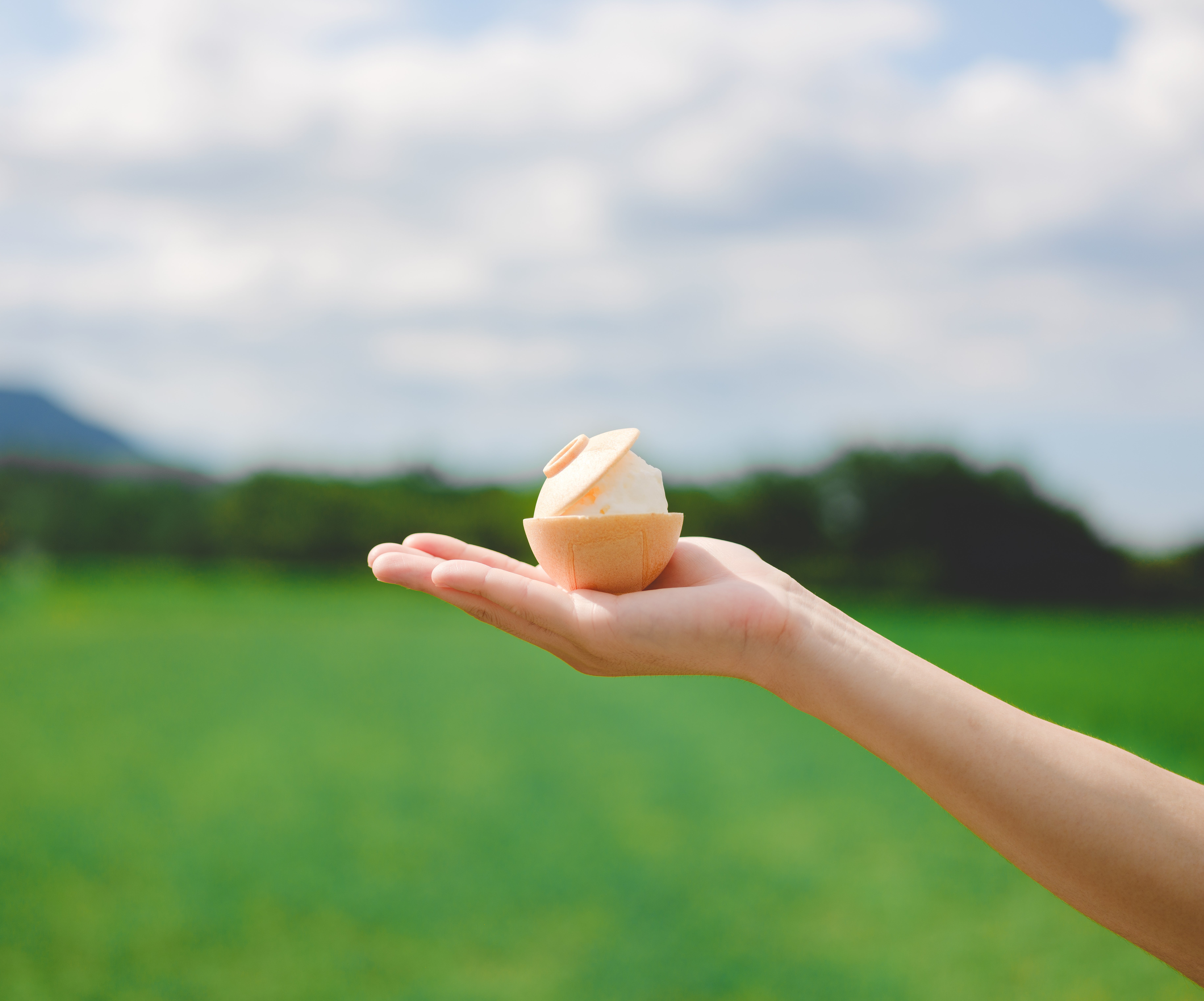 送っていただいた灯す屋さんのちゃわん最中に早速馬場ファームの脇山米ジェラートを入れてみると、お茶碗にお米を山盛りついだような美しい見栄えに!