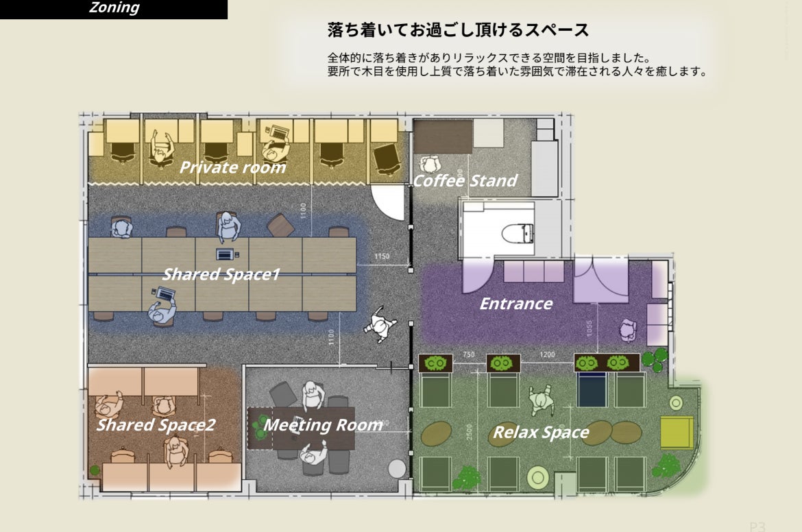・シェアードスペース1(8~10席)は一人分の机のスペースを120㎝×70㎝と広めに取ります。そのため、席数を若干削るかもしれません。