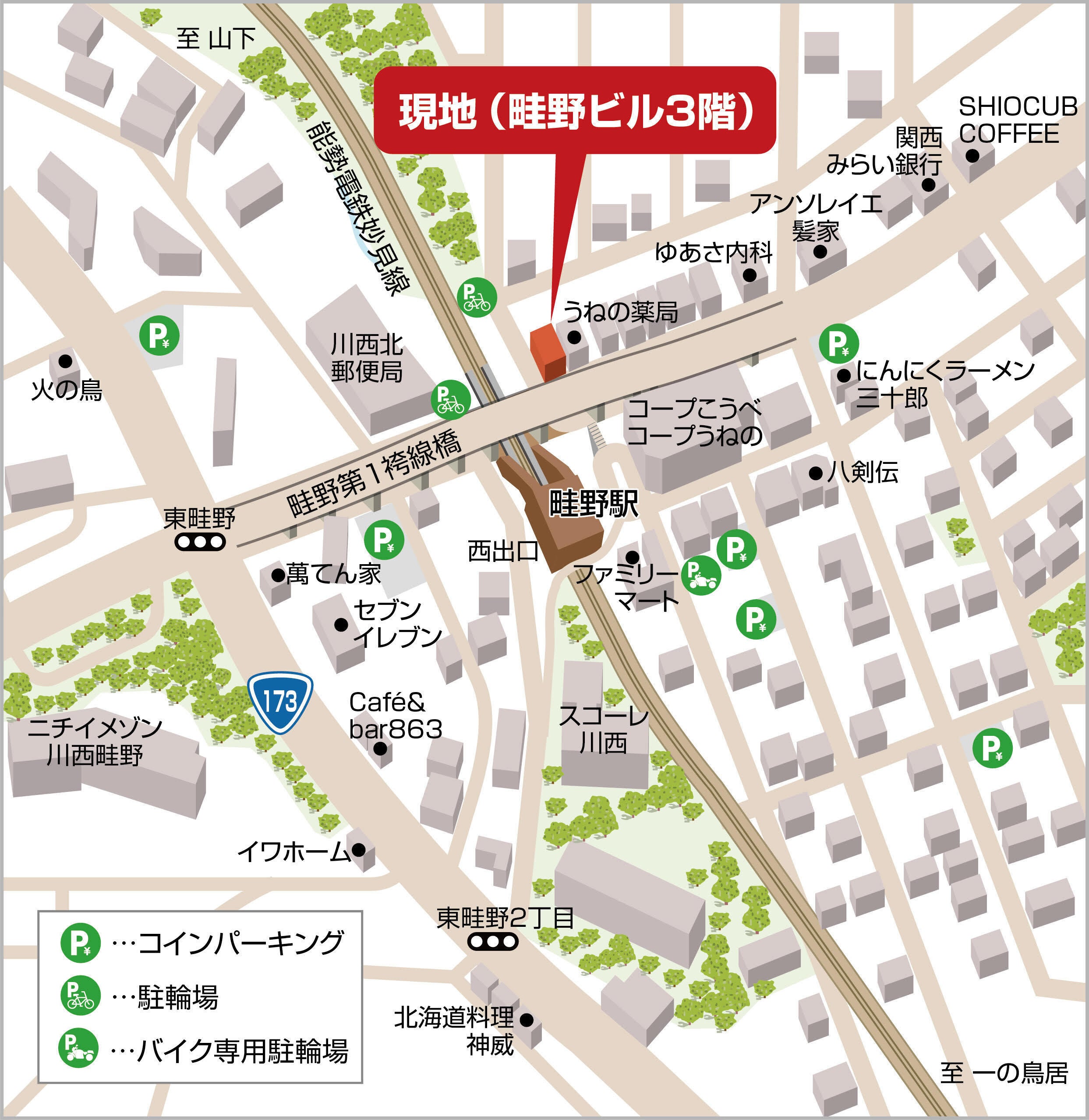(川西能勢口から173号線を北上、東畦野交差点を右折すぐの左手のビル3階)