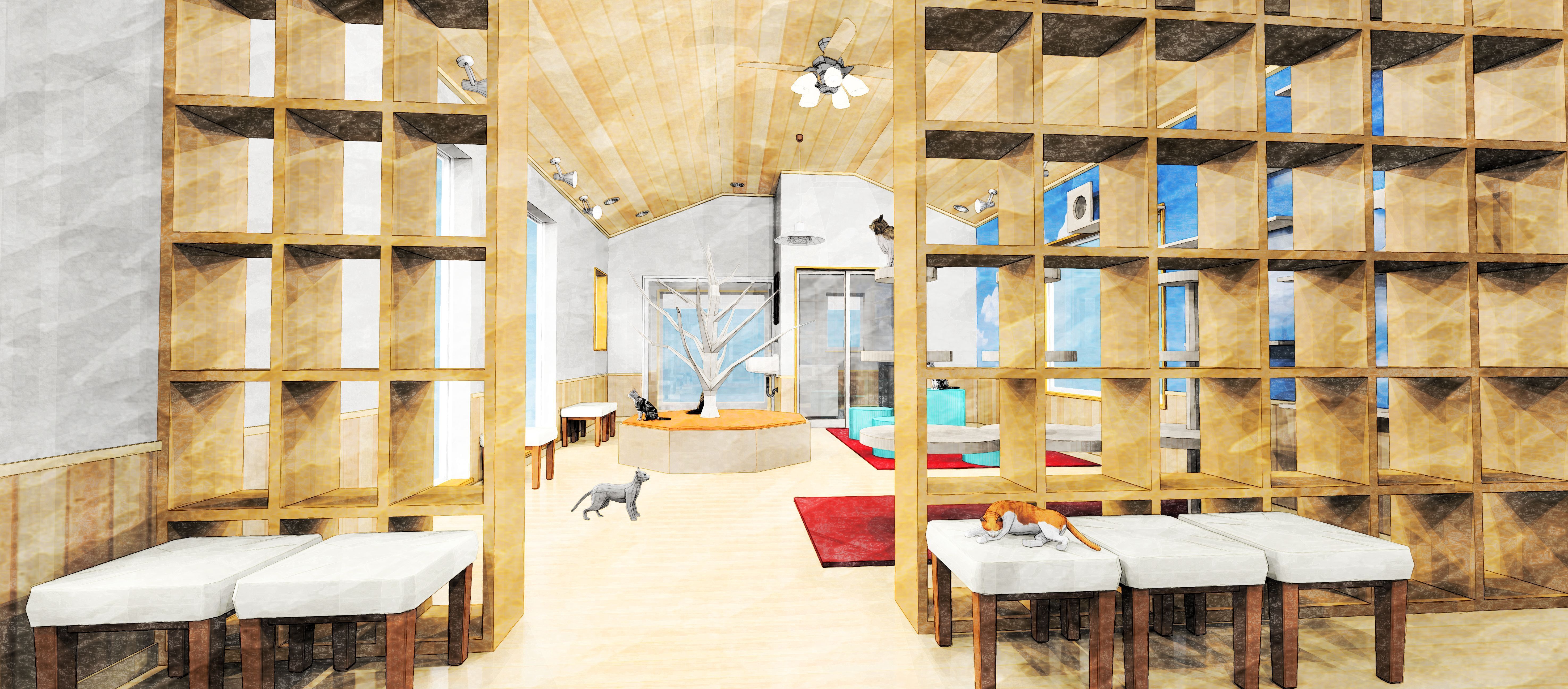 猫のお気に入りの居場所をたくさん、もちろんキャットウォークはたくさんに。パースでは再現していませんが、天井面全面を考えています。