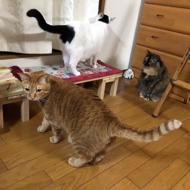「又々、写真が、いっぱいで、、、何をお送りしようか、迷っています。先ずは、ニャンズ纏めて。長男昊兵と長女波衣(はい)は、一年違いで、徳島の団体から来ました。波衣は他の皆と馴染めずに20対1で、虐められていて、引き取って貰えないかと!?、相談を受けた子です。トライアルで、めげそうに成りながら、昊兵が決めて貰い受けました。末っ子は、ちゃあぼ、、、、難波の本宅に半年余り、毎日4回ご飯を食べに来て、、、、で、ウチの子に成りました。」