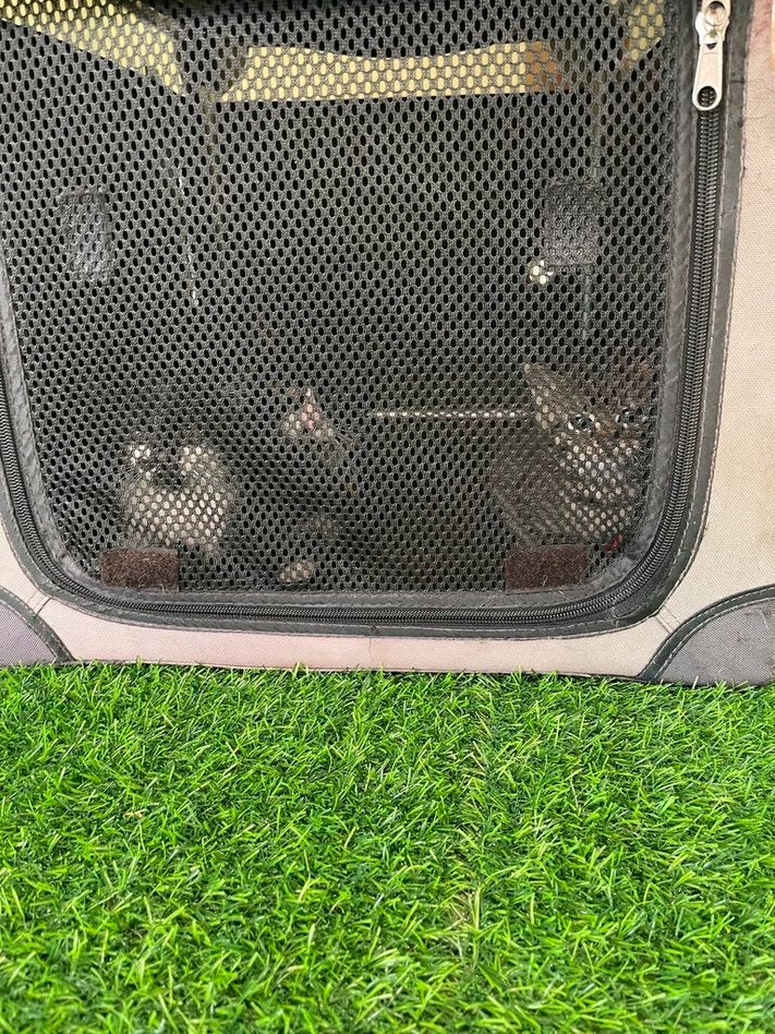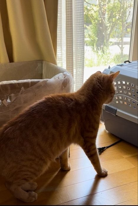 逃走車内は狭所で椅子の隙間など外に逃げることは無くても非常に困難捕獲になりました。また、ダッシュボードに入り込み、自動車整備工場さんの手をお借りし何とか捕獲、頑丈なケースに移し、工房の窓際で外を眺めエアコンが聞いた部屋で。預けの方にケージをお願いしていましたので、そのケージをニャンコが穴を開けたので、急いでホームセンターで調達、組み立ててみると、扉に隙間があったり、このニャンコ達には不十分なようで、逃走を防止のためにやむなく、手持ちの狭いケースにて一泊。逃げたくて夜泣きするのかと思いましたが、朝まで静かに過ごしてくれました。元野良の茶々が、見守ってくれたからかも知れません。互いに威嚇することもなかく安心でした。朝、目にしたのが、茶々のおもちゃが、ケースのドアのところに置いてあり、たまたまの偶然なのか?茶々が仔猫のために持ってきたのか、ちょっとしたミステリーになりました…。