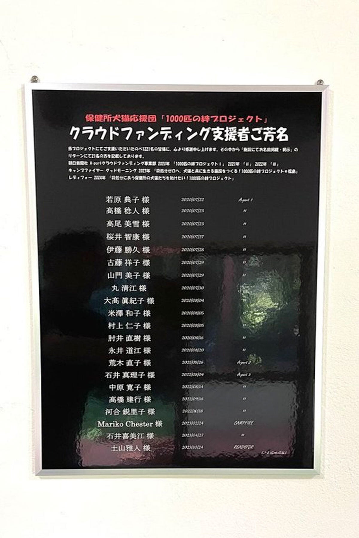 今までご支援いただいた皆さまの中で、施設へのリターンとしてお名前掲載のご支援者様をパネル掲載させていただきました。