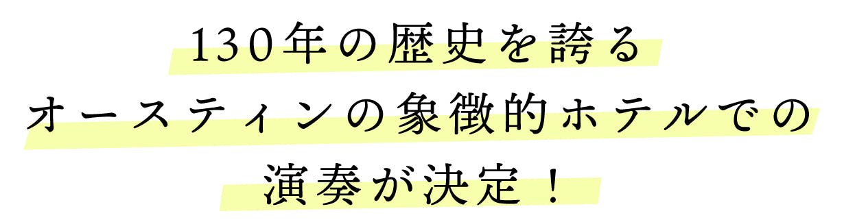 SXSW Music Festival(サウスバイサウスウェスト・ミュージックフェスティバル、以下SXSW)は世界中から厳しい審査を通過したアーティストが演奏する大規模な音楽フェスティバルです。イベントは10日間に渡り、300以上のアーティストが集います。私はThe Driskillという、130年の歴史を誇り、長年に渡り上流社会のイベントや歴史的な政治的イベントが開催されてきた場所であり、ホワイトハウスの報道陣の本部としても使用されてきた高級ホテルで演奏することが決まっています。