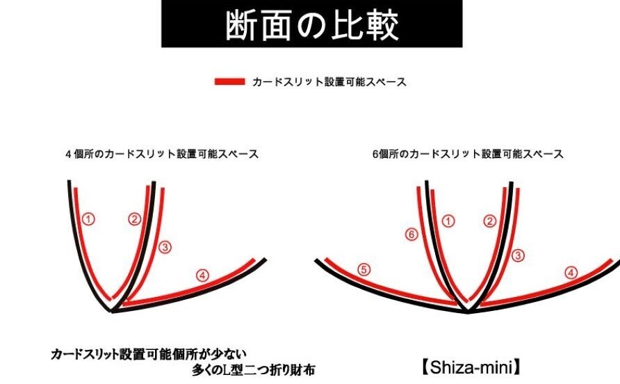 多くのL型二つ折り財布のカード収納スペースは、L型内部と片面フラップの合計4面。ハイブリッド系【Shiza-mini2】では、L型の両サイドにフラップを設けることにより6面にカードスリットを設置する仕様を可能にしました。