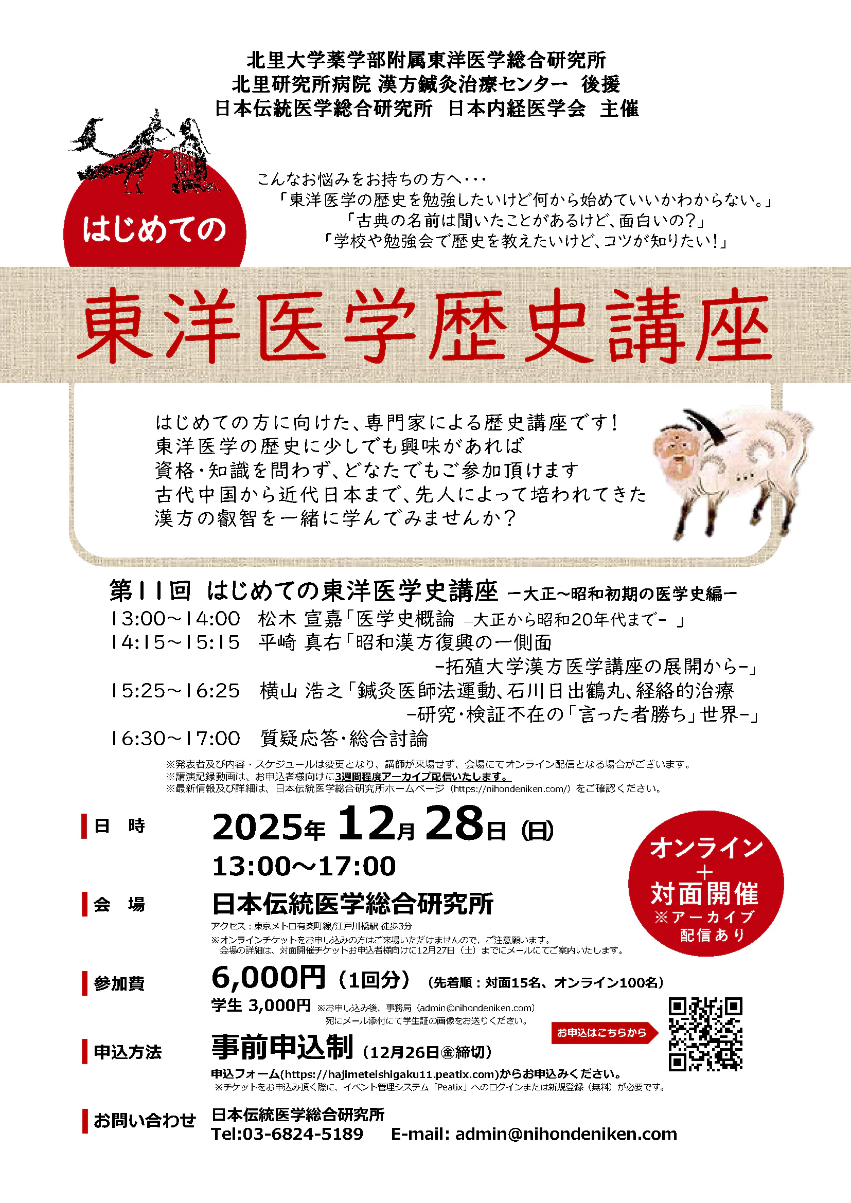 12月28日(日)に、日本伝統医学総合研究所・日本内経医学会共催「はじめての東洋医史講座」を開催する運びとなりましたので、下記の通り、ご案内申し上げます。