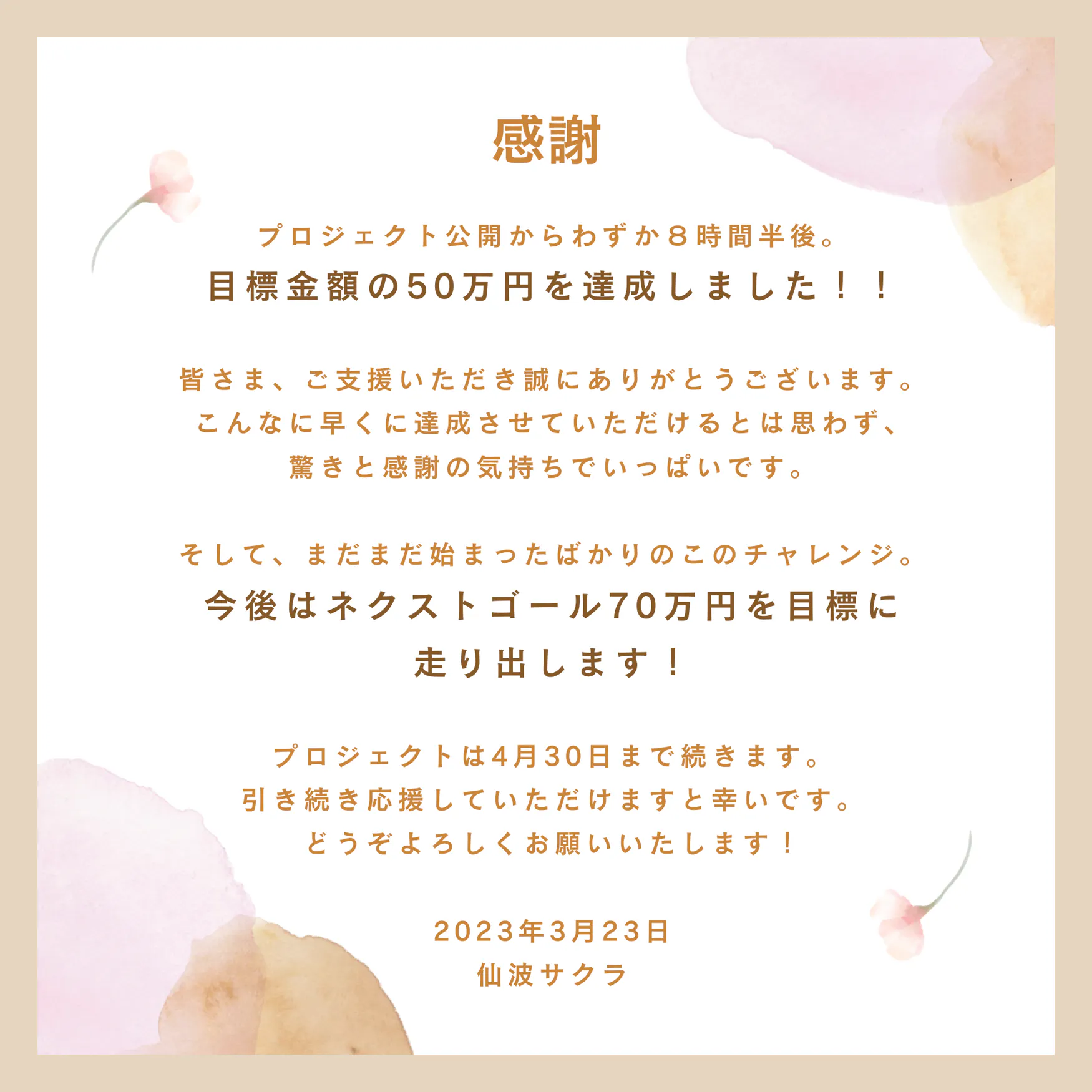 こんなに早くに達成させていただけるとは思わず、驚きと感謝の気持ちでいっぱいです。既にご支援してくださっている皆さま、本当に本当にありがとうございます。皆さまのあたたかいメッセージ全てが励みになっています。