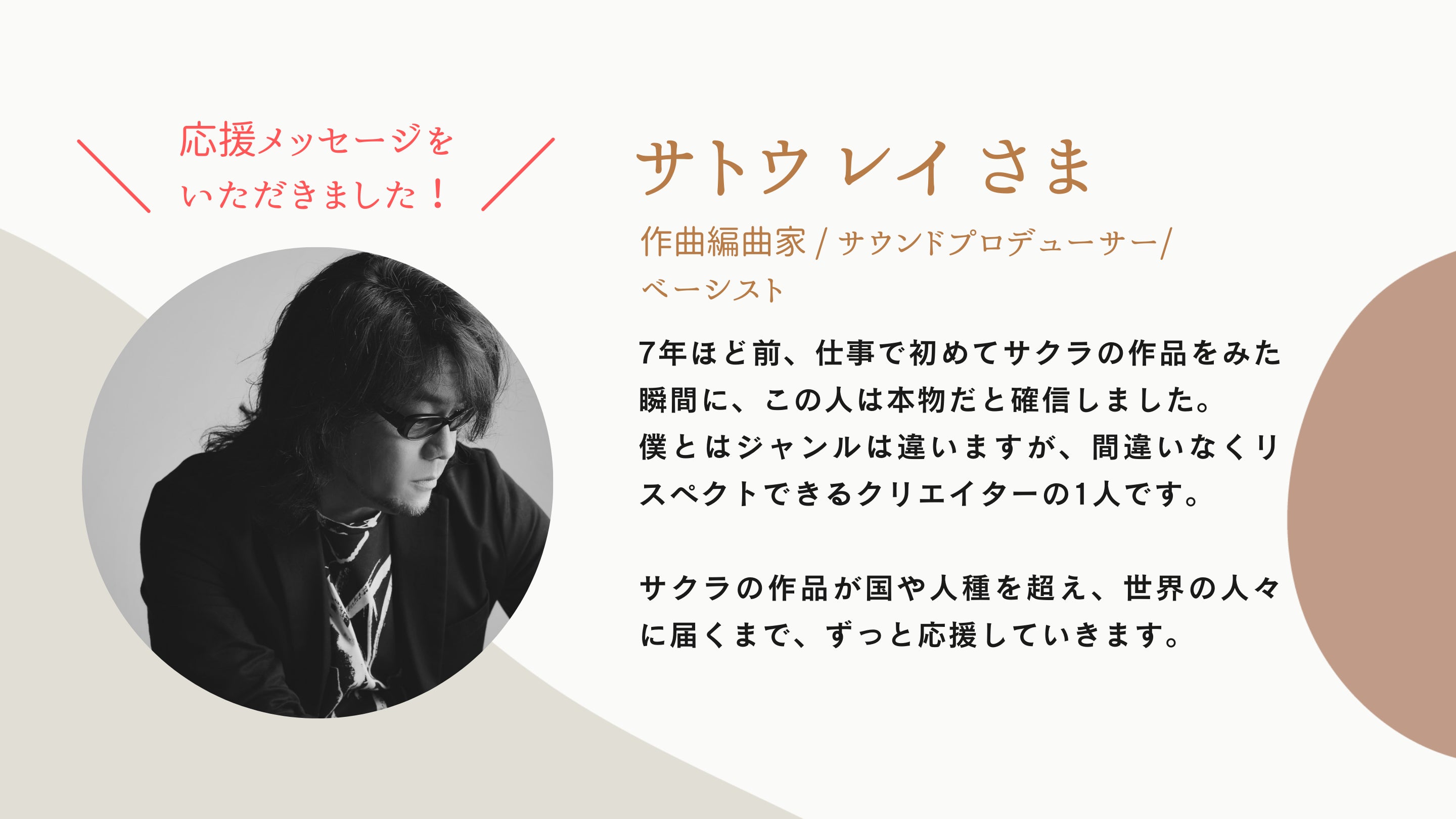 音楽と絵はジャンルが違いますが、作家としてただ良いものを創るために、様々なものを捨てたり手に入れたりしながら、光を目指す先輩・そして仲間としていつも多くのことを学ばせて頂いています。いつも本当にありがとうございます。