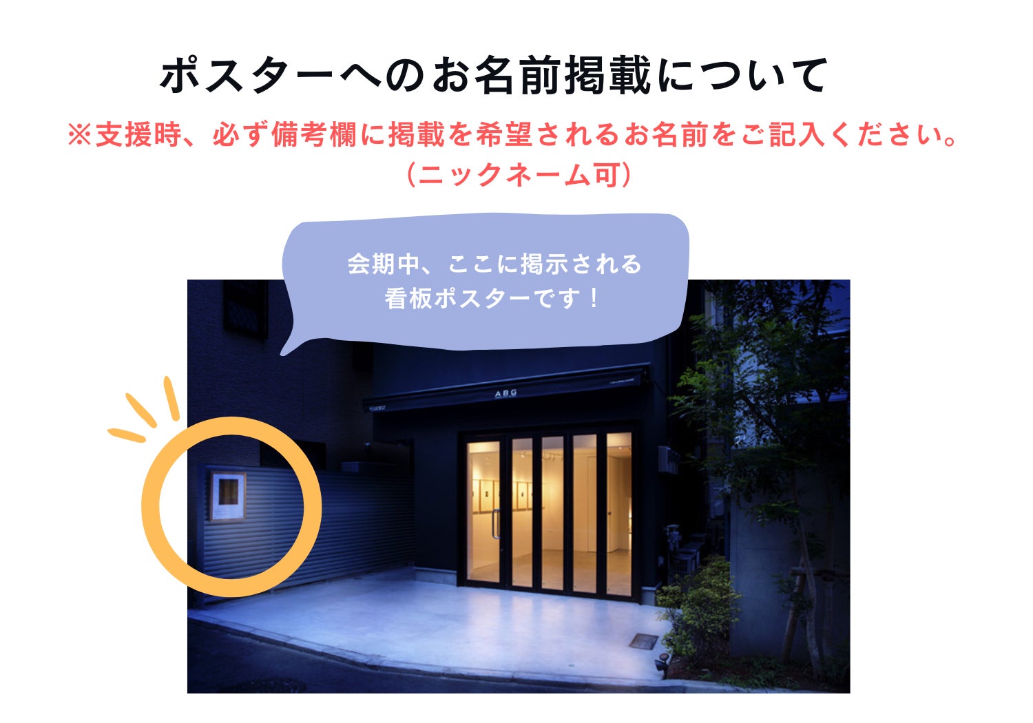当日ギャラリーにて掲示するポスターにお名前 (ニックネーム可) を掲載させて頂きます。※支援時、必ず備考欄に掲載を希望されるお名前をご記入ください。