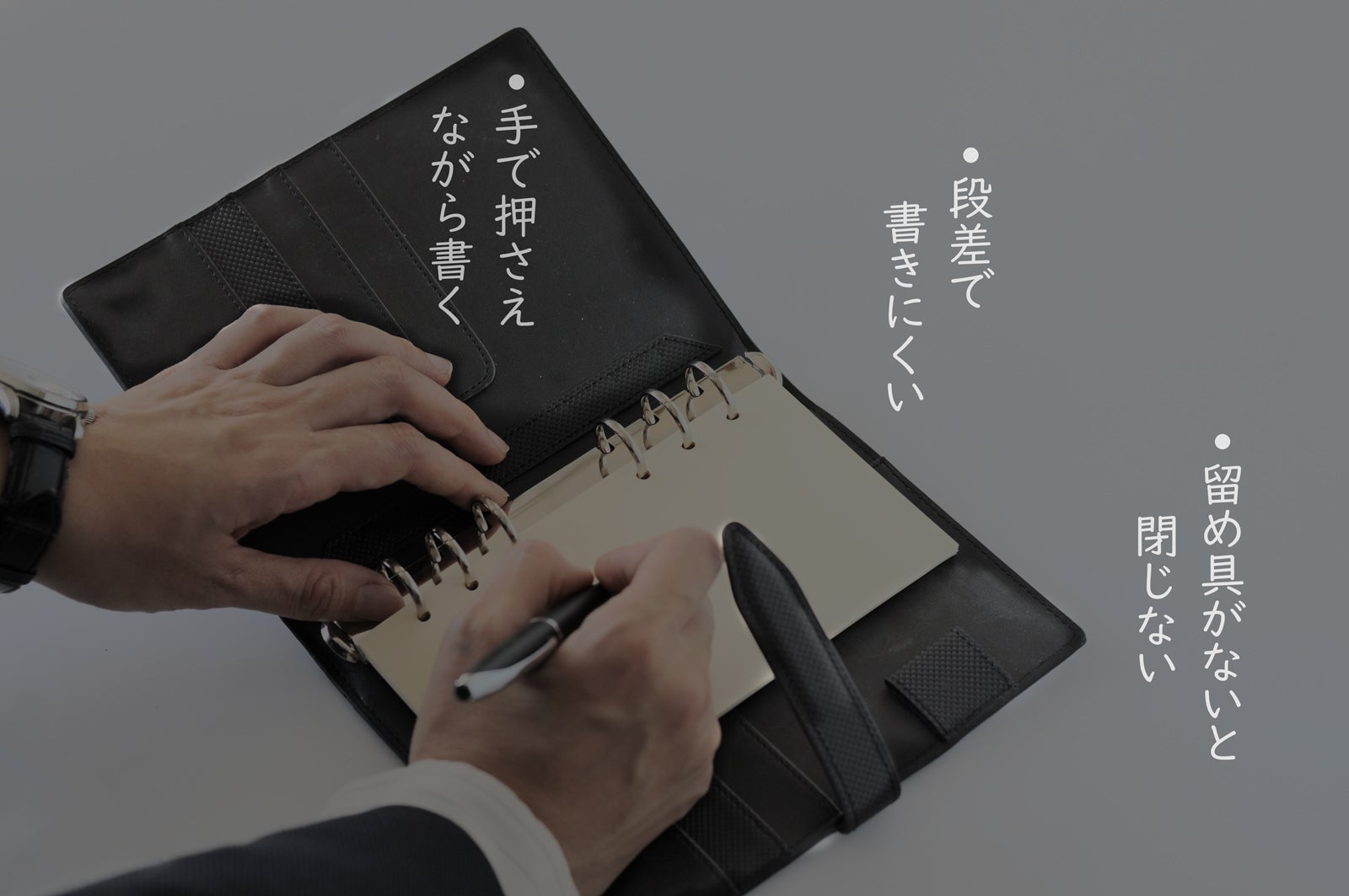 一般的なシステム手帳は、カード入れ・ペンホルダー・閉じベルトなど色々な付属機能が備わっています。しかし、これらの付属機能により段差が生じ、肝心の「書き心地」が損なわれていませんか。