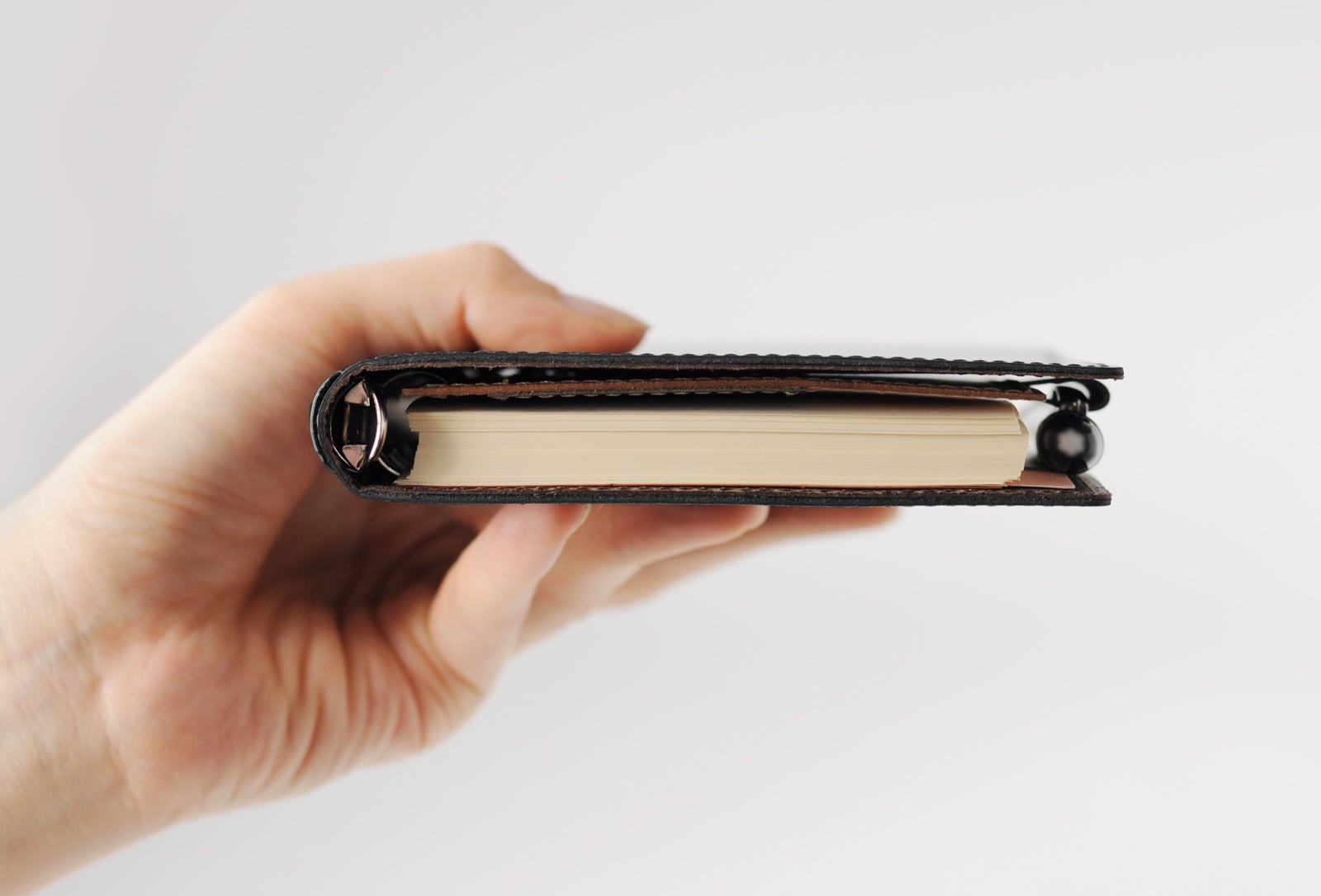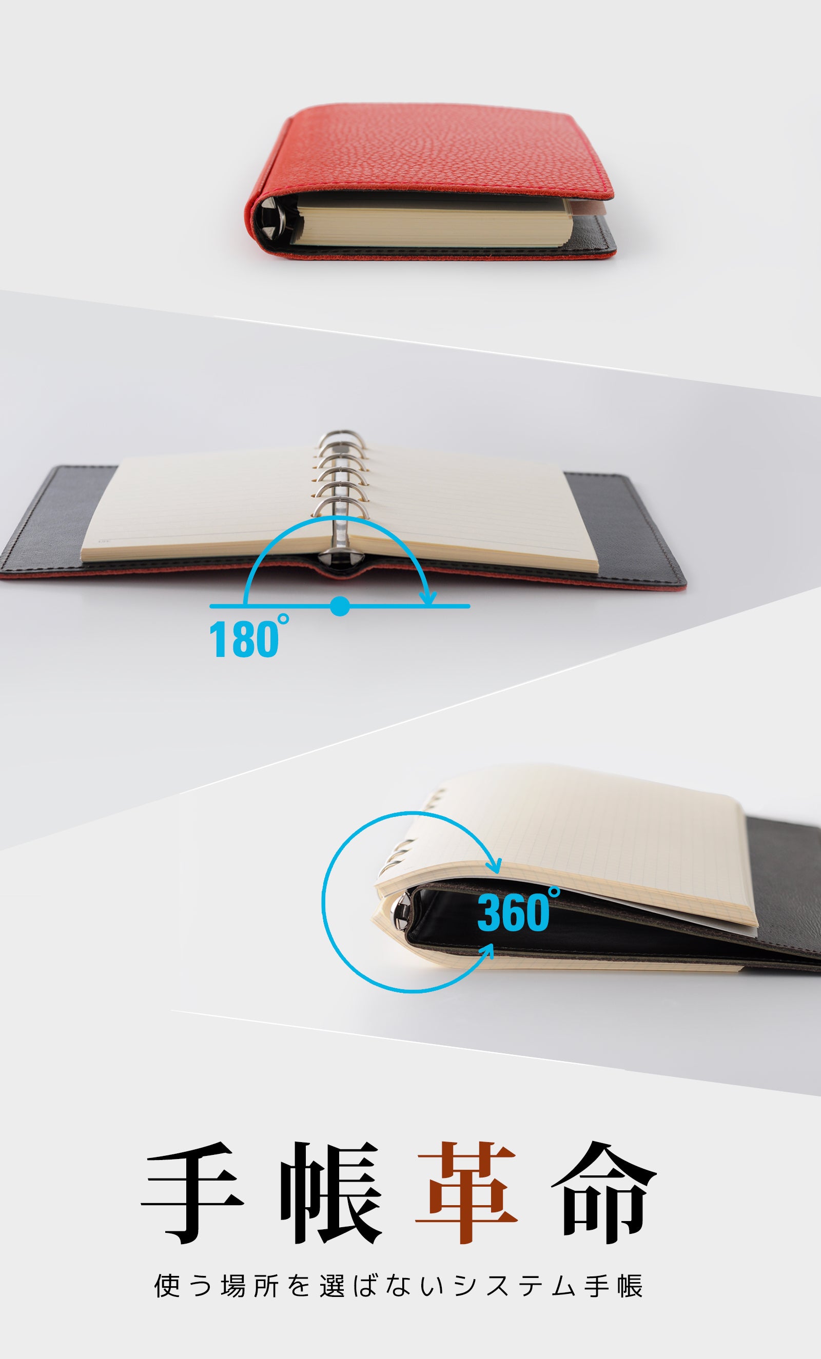バックプレートとリングで貼り合わせた一枚革を挟む構造により、完全に開いた状態で使用できます。また、デスクがない環境では折り返した状態で使用可能です。