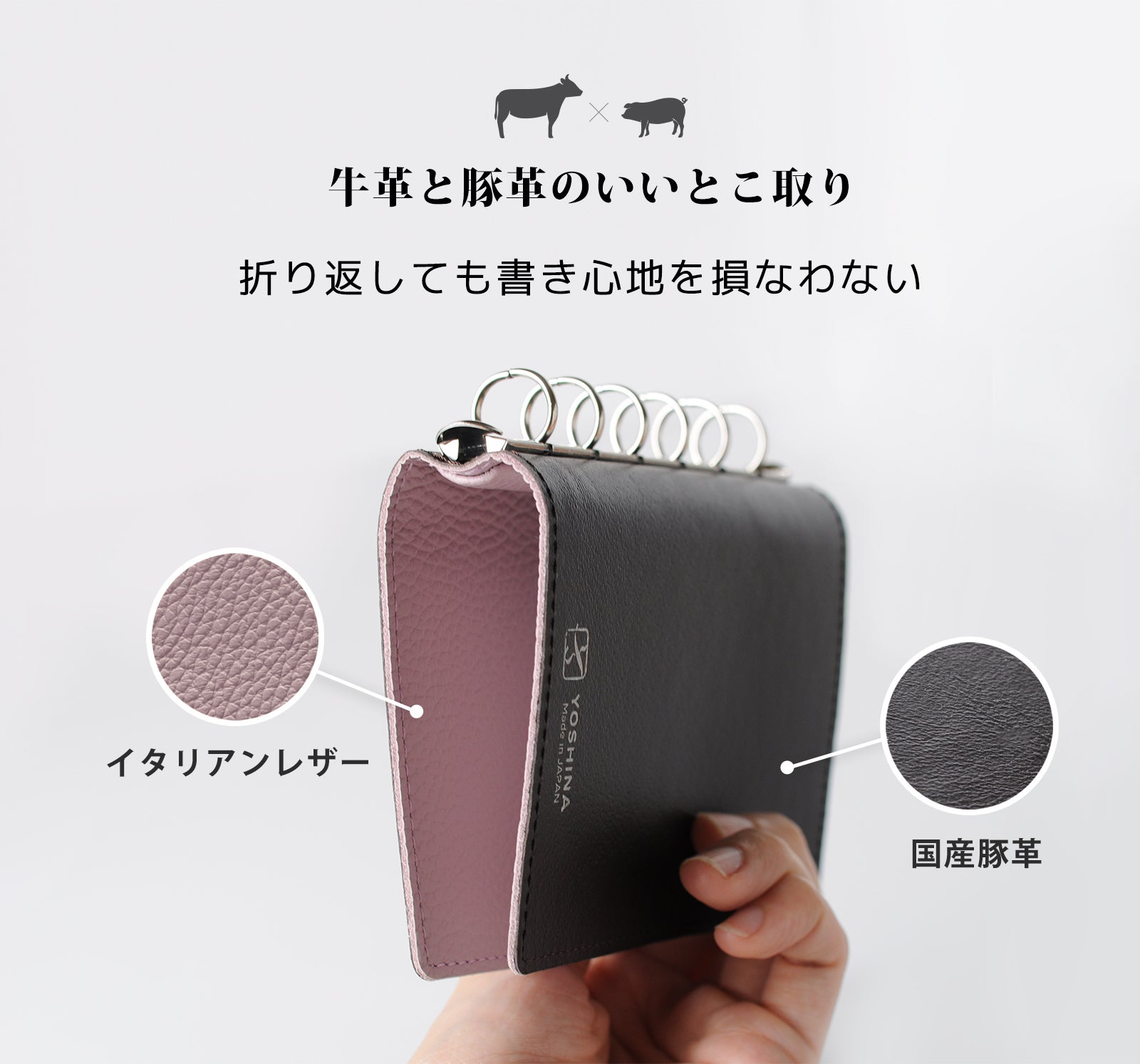 YOSHINAシステム手帳はイタリアならではの美しい発色を持った汚れにくい牛革と国産豚革のそれぞれ一枚革を厚みを調整しながら貼り合わせて使用しています。