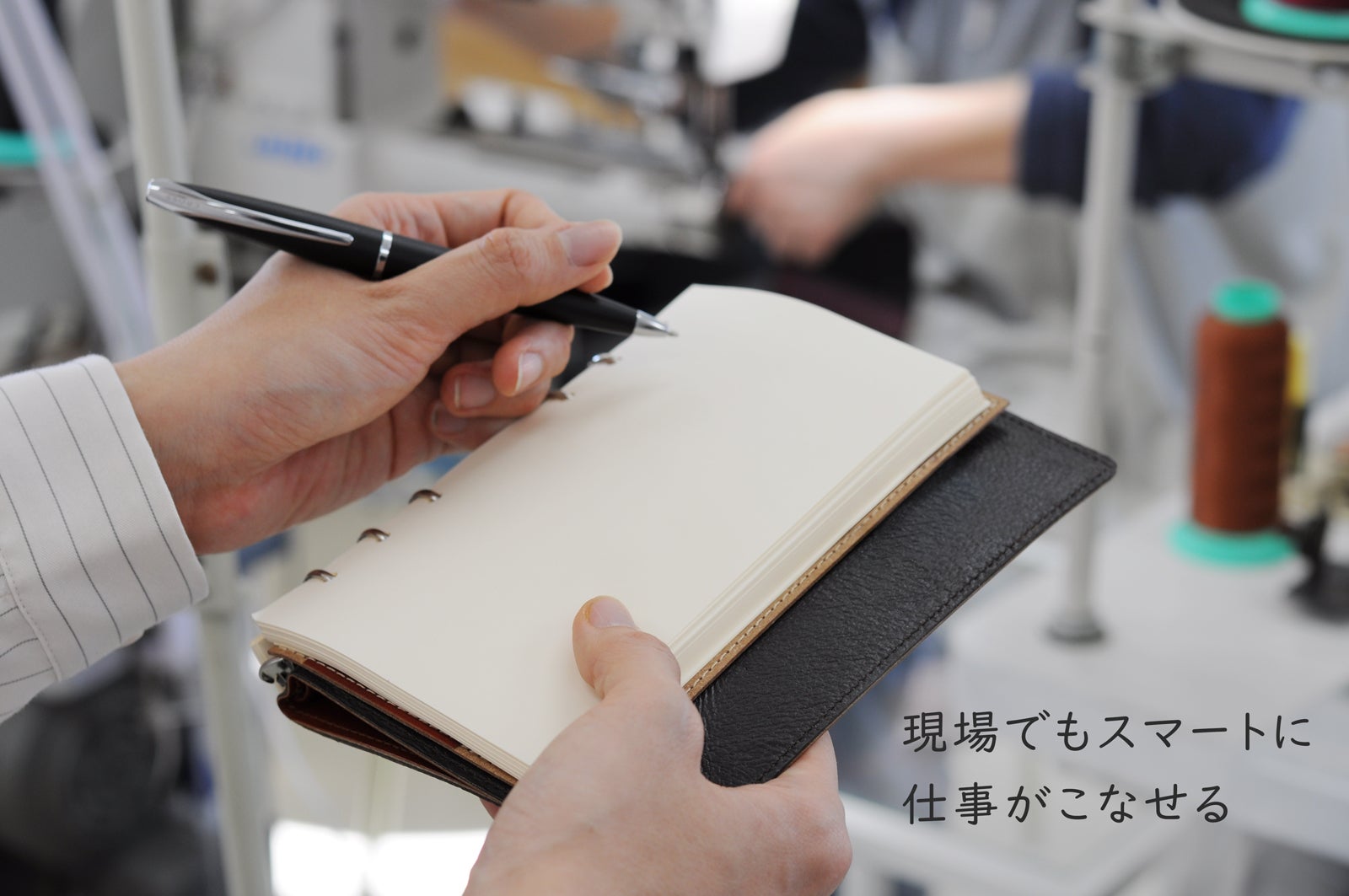 YOSHINAは、より長くお使い頂くことと書きやすさのために、革の間に強度の強い紙芯を貼り合わせています。そのため、手帳の形が崩れにくいほか、折り返した状態で使用する時も、下敷きの効果を発揮し、デスクの上と同じ書き心地が保てます。