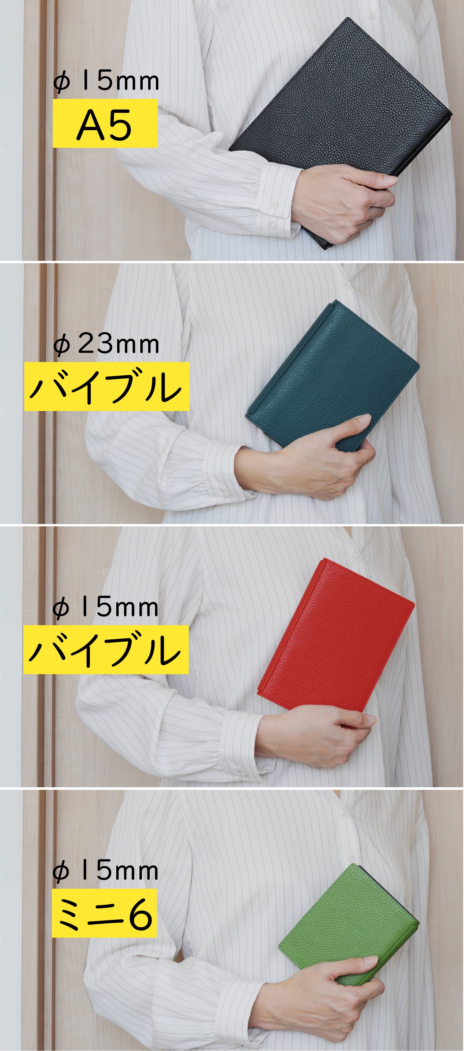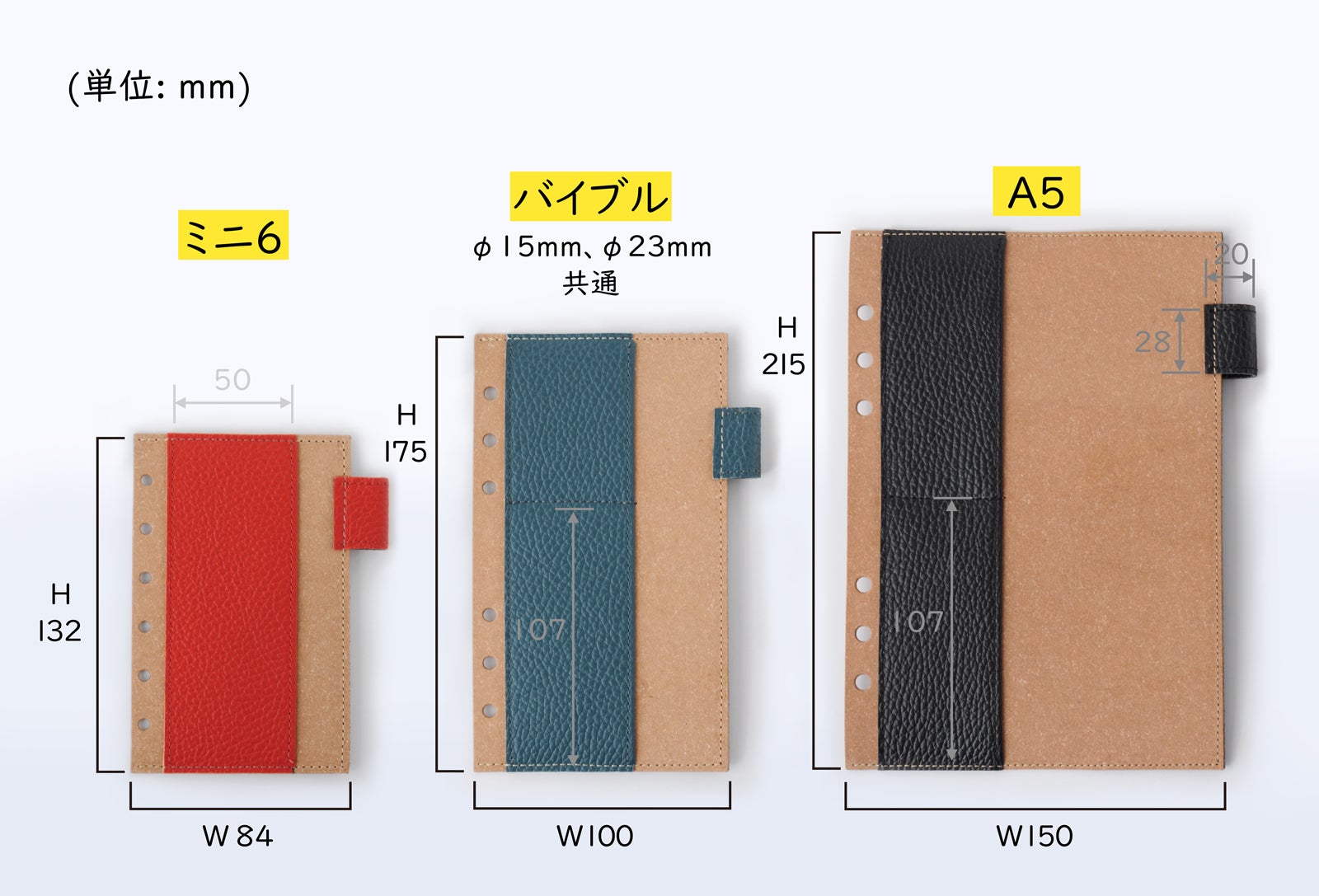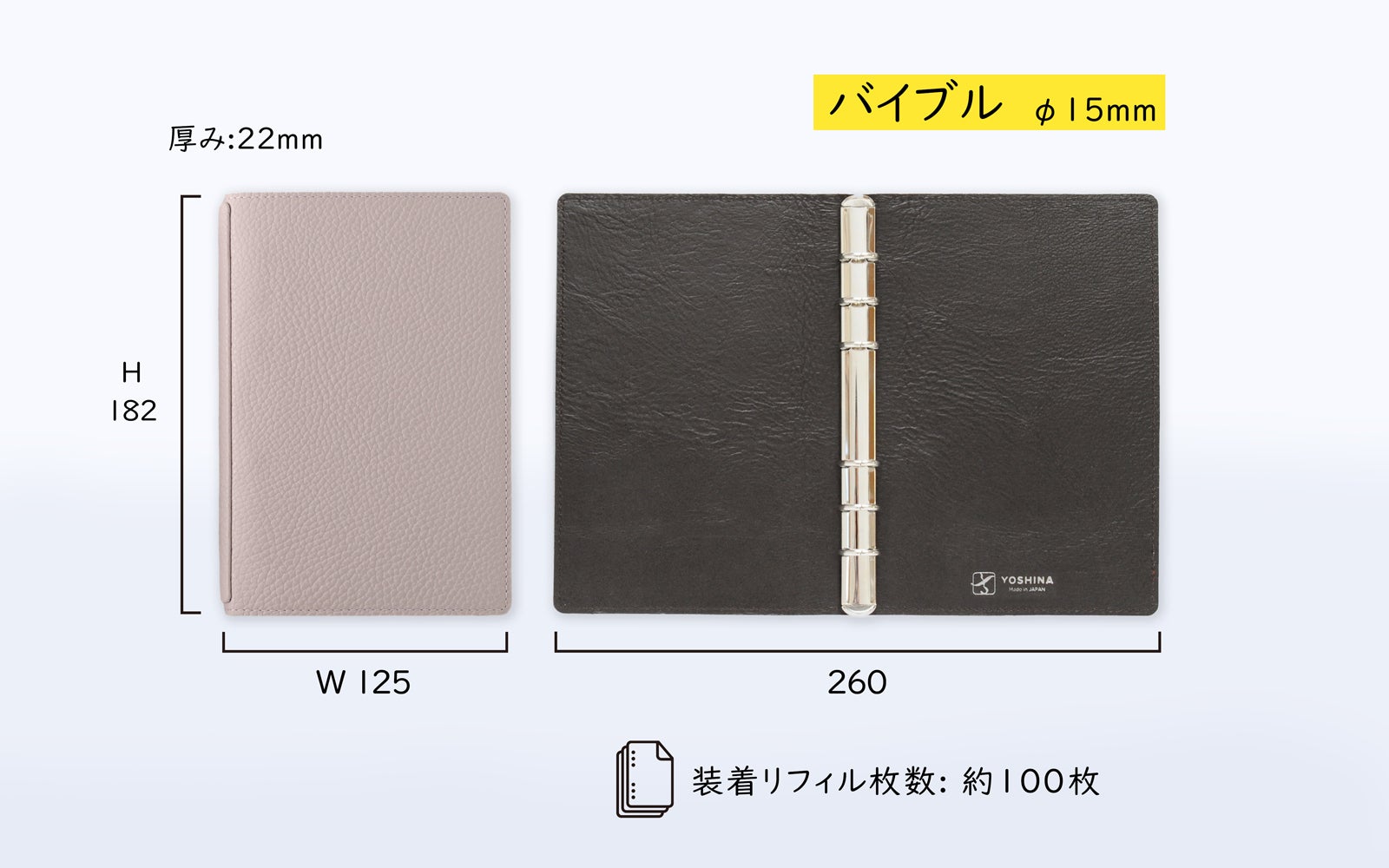 YOSHINAは使用スタイルとシーンにより、3種類の手帳サイズとリング径違いの製品をご用意しました。