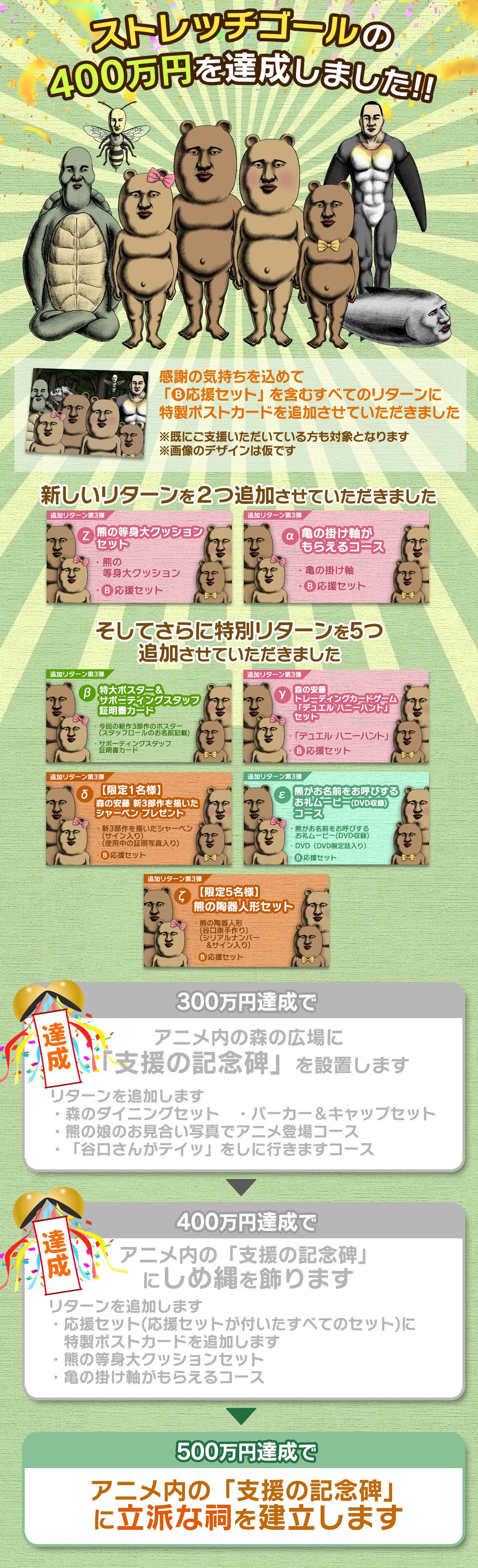 ストレッチゴール達成のアニメパワーアップとして、アニメ内の森の広場に、皆さんからのご支援を記念した「支援の記念碑」を建立させていただきます。 また、さらなる新しいグッズなどのリターンも追加させていただきました。