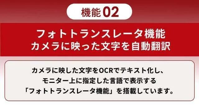 フォトトランスレータ機能を使えば、写真の無いレストランのメニューも、いちいちスマホに文字を打って辞書で調べなくても、モニター内の文字をまとめて翻訳。