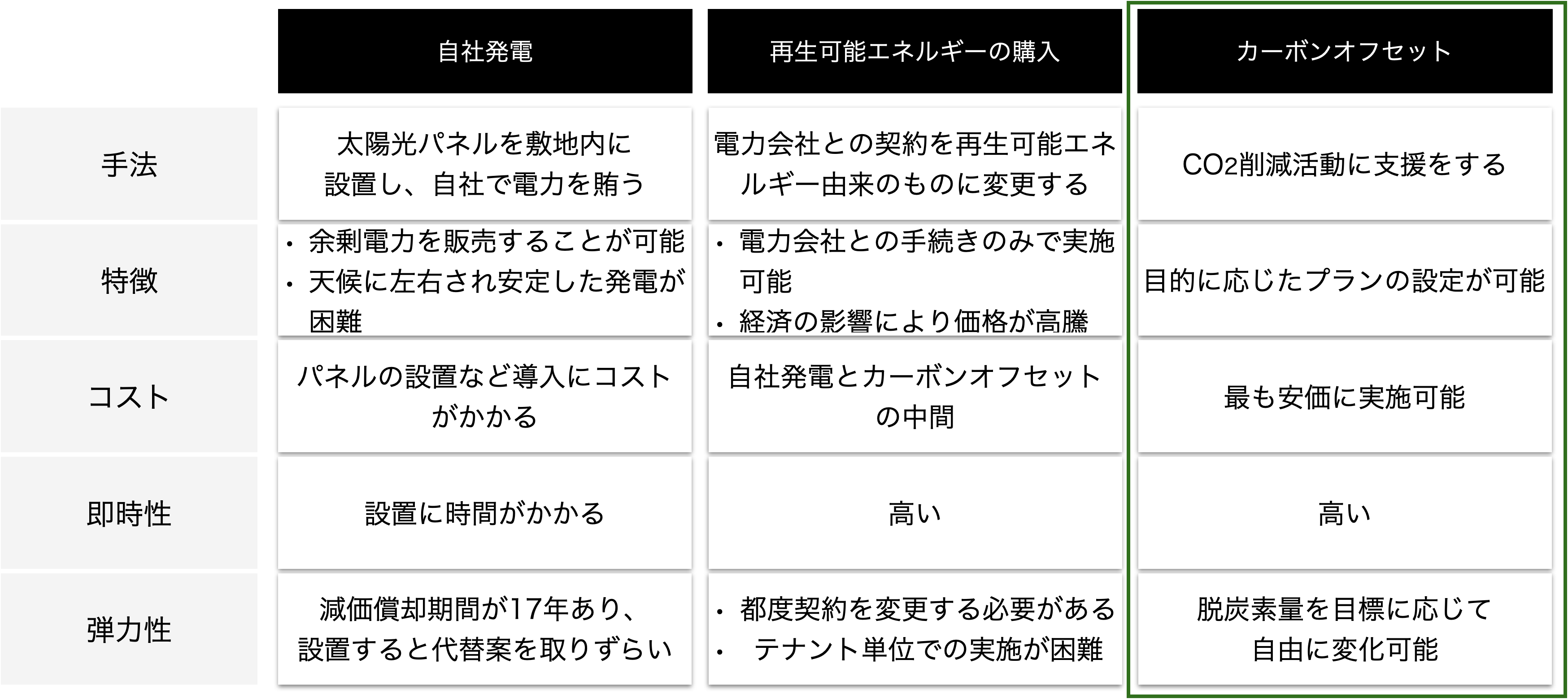 カーボンオフセットはその中で最も低コストかつ削減割合を自由に決められる方法です。