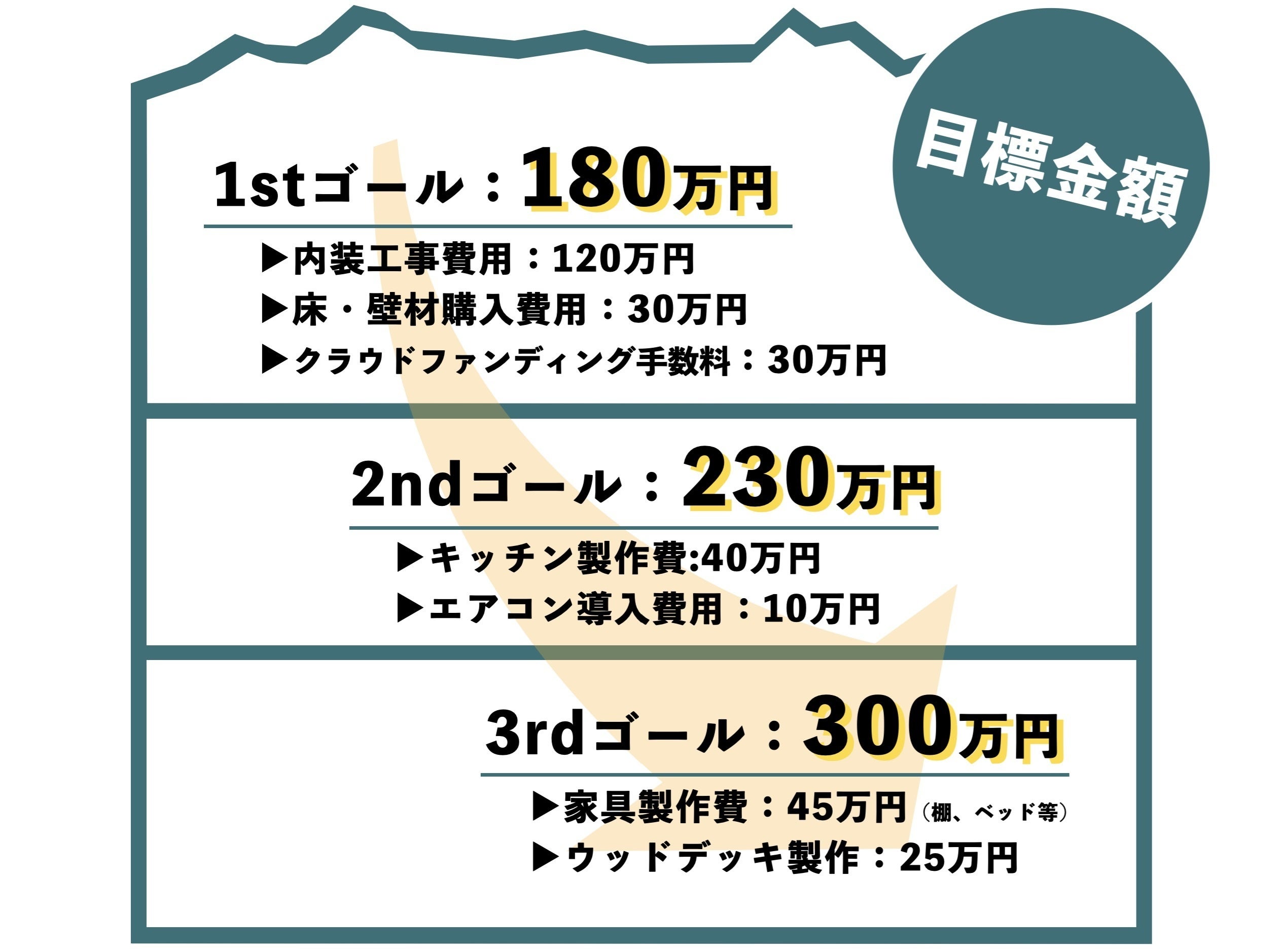 現在すでにボランティアで参加してくれている大学生のみんなとDIYは進めていますが、自己資金とクラウドファンディングを活用して実現していきたい範囲が以下の目標となります。