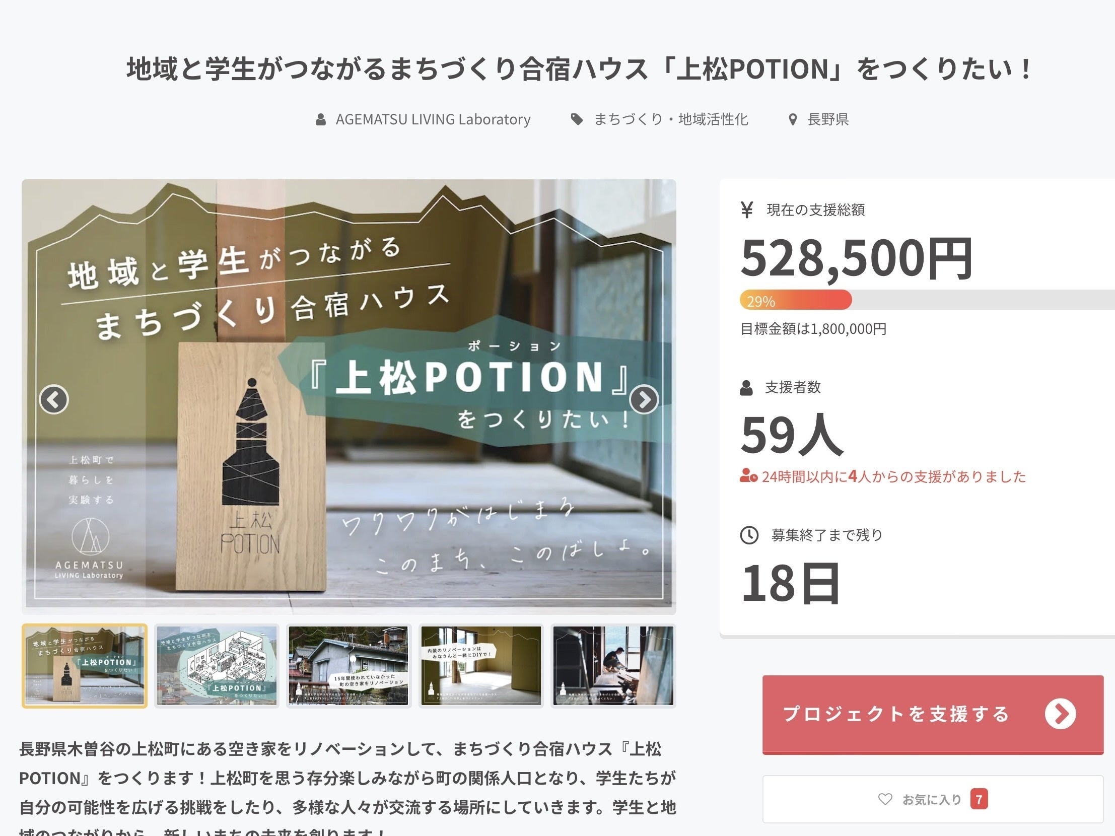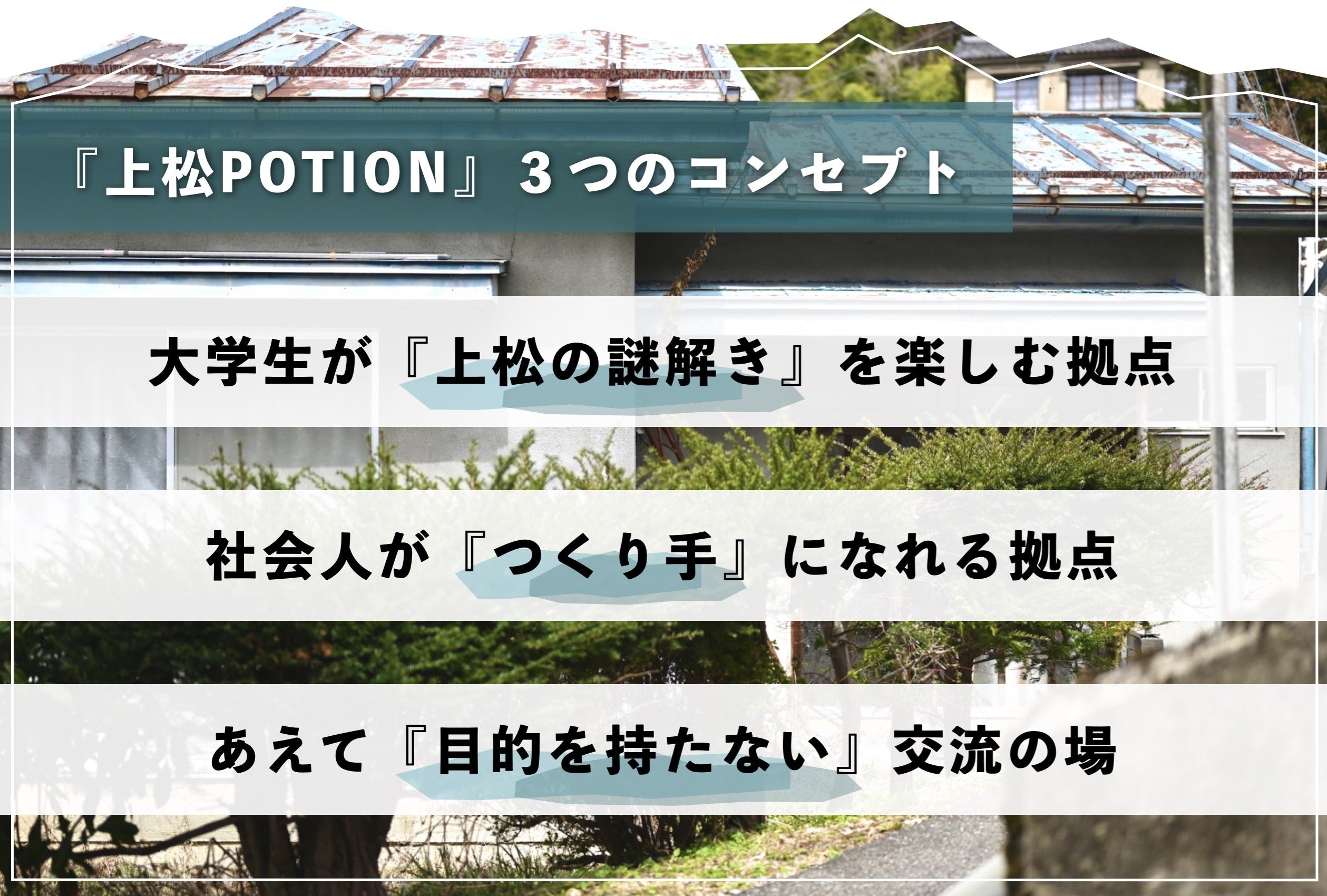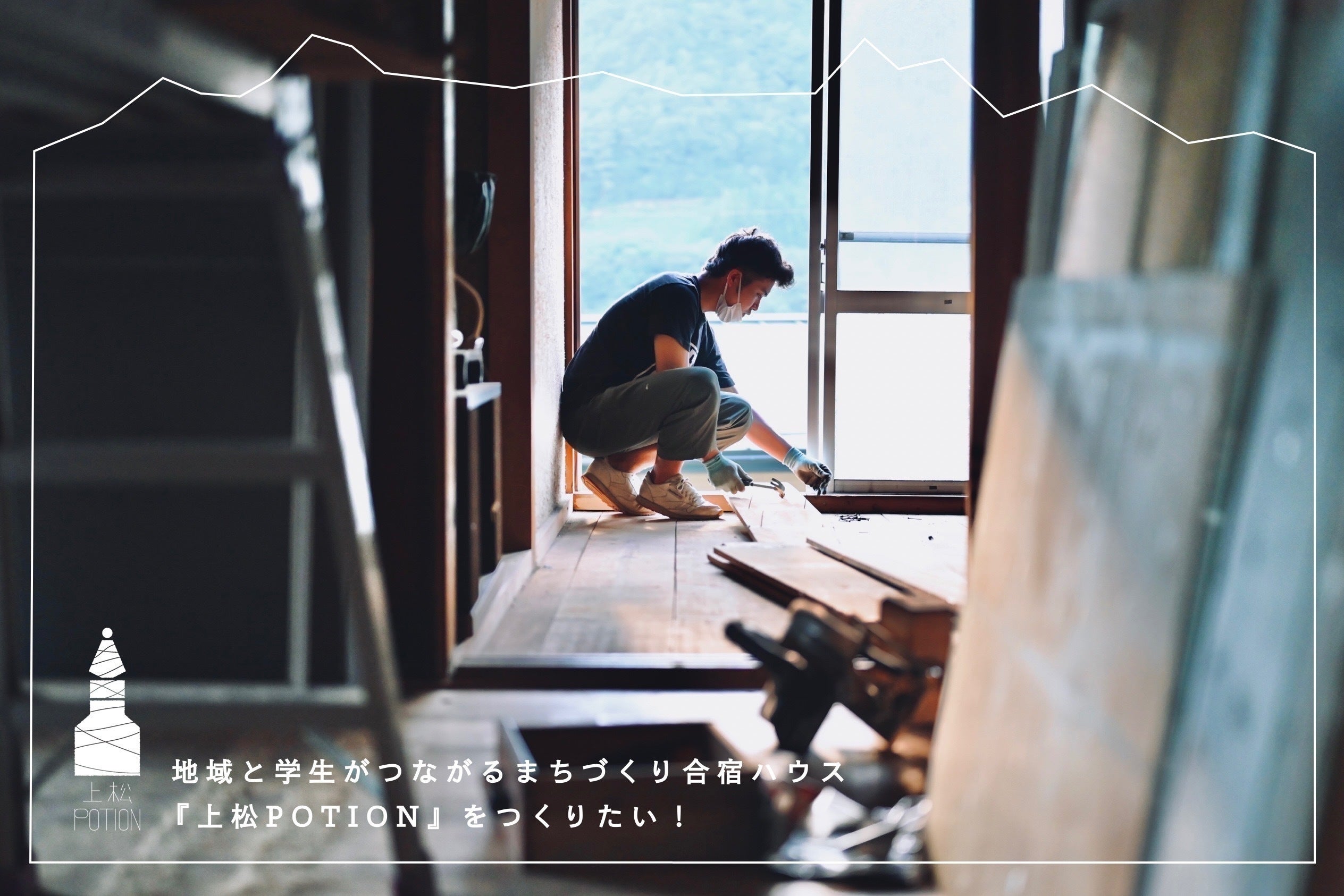 今回のプロジェクトは、上松町の空き家を改修し、上松町に来てくれる大学生をはじめとした様々な方が無料で滞在できるつながり拠点「上松POTION」をつくるために起案しました。