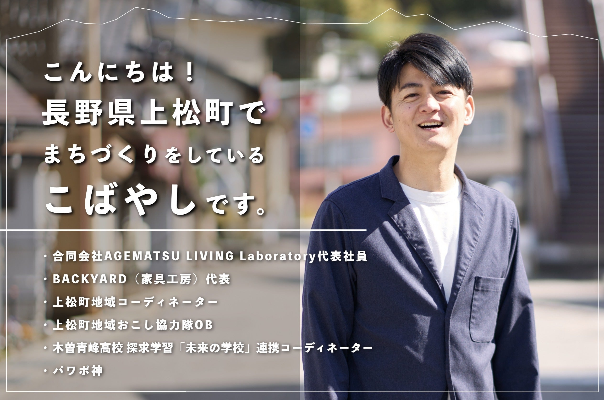 2017年に上松町に移住し、「木工の東大」上松技術専門校の1年間、地域おこし協力隊の3年間を経て、現在は個人で木工作家をしながら、民間のまちづくりに取り組む会社「AGEMATSU LIVING Laboratory」を運営している、小林です。