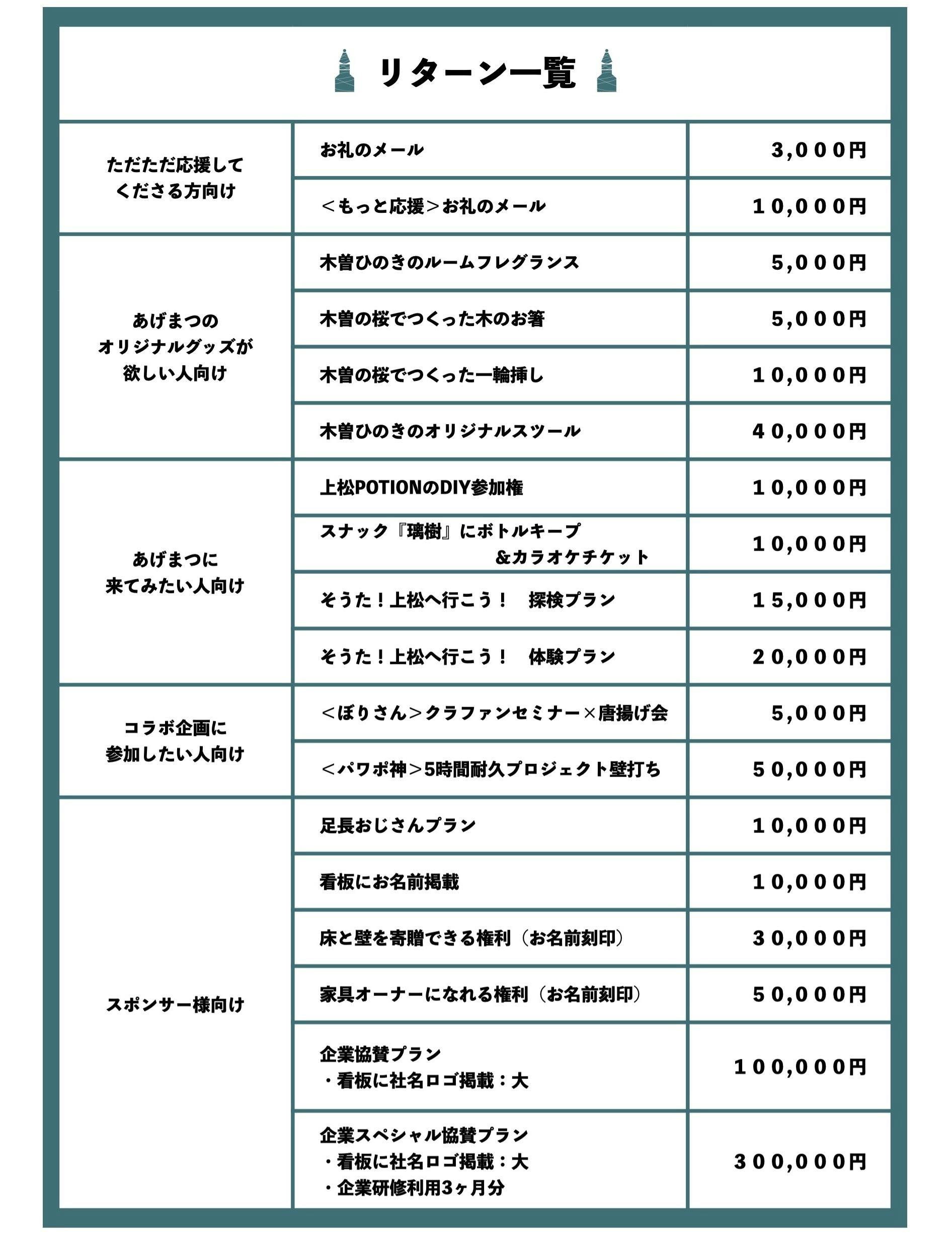 リターンには上松町や上松POTIONの魅力を体験できるもののほか、僕たちのものづくりに触れて頂けるようなものをご用意しました!ぜひご覧ください!