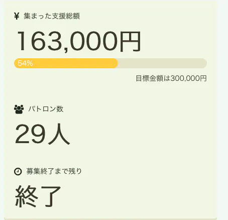 プロジェクトへの支援が終了致しました!