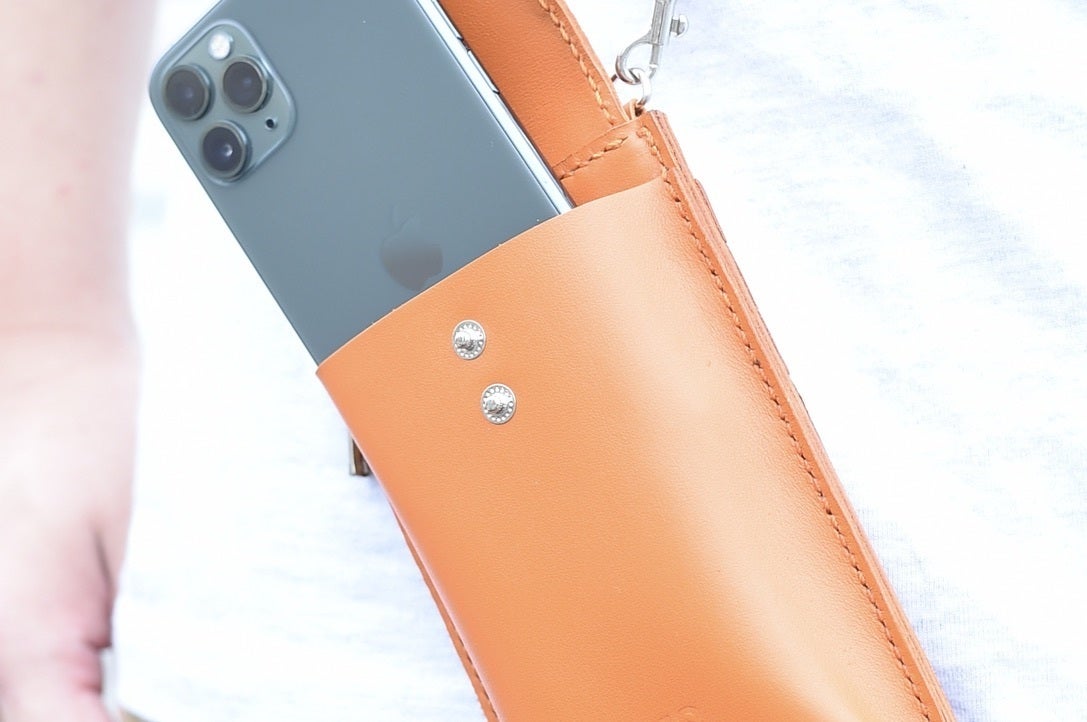 ②スマホポケットはiPhone pro収納可能。(約縦15cm×横8cm×幅1.5cm)