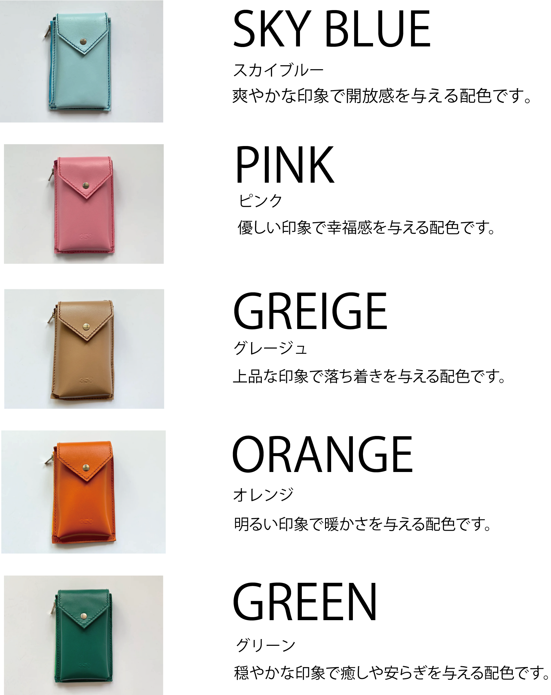 少し光沢のあるスムースレザーを使用し、カラーは5色ご用意いたしました。