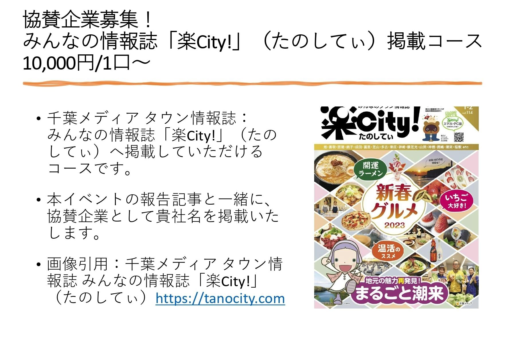 協賛企業になっていただいた企業様へは、感謝の気持ちを込めまして、千葉メディア タウン情報誌:みんなの情報誌「楽City!」(たのしてぃ)4/25発売号に掲載させていただきます。