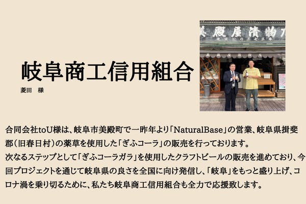 私たち3人は、2020年10月 岐阜県・旧春日村の薬草を使った完全無添加の『ぎふコーラ』を作りたい!というプロジェクトでクラウドファンディングに挑戦させて頂きました。総勢約450人の方々からご支援を頂き、初回製造、販売、そして今日に至るまでプロジェクトを遂行しています。私たちのような無名の若者に対して、想定を遥かに越える方々から応援を頂けたことは、私たちにとって最大の財産となり、最大のパワーとなりました。