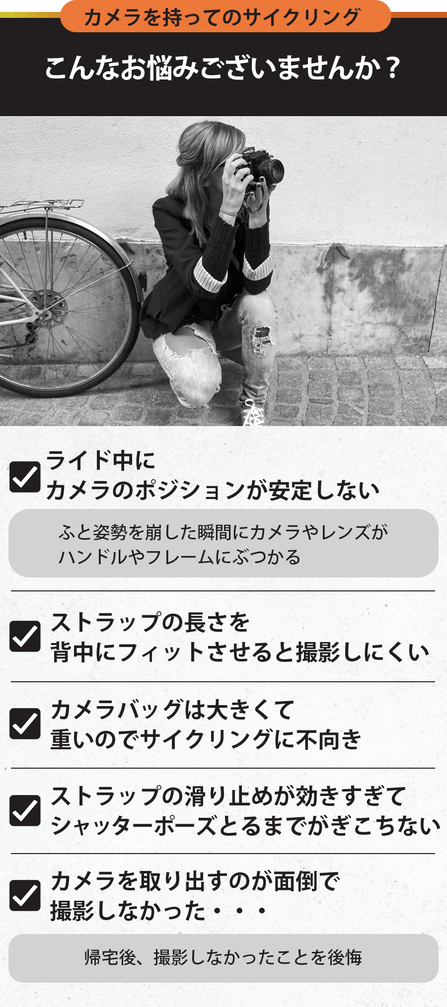 このサイクリングカメラストラップを通じて、1人でも多くのサイクリストの悩みが解決されることを願っています。