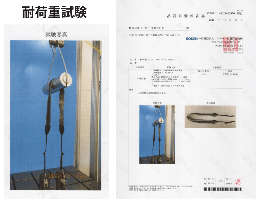 国内検査機関にてストラップの耐荷重試験を実施。両端はニコン巻き。約88kgにて破断