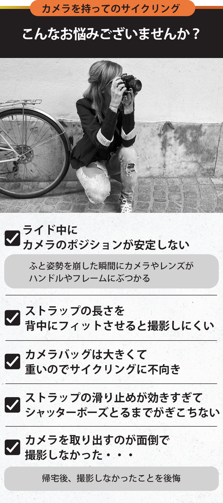 このサイクリングカメラストラップを通じて、1人でも多くのサイクリストの悩みが解決されることを願っています。