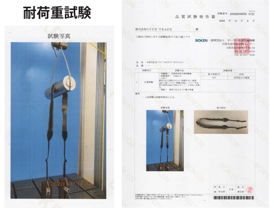 国内検査機関にてストラップの耐荷重試験を実施。両端はニコン巻き。約88kgにて破断