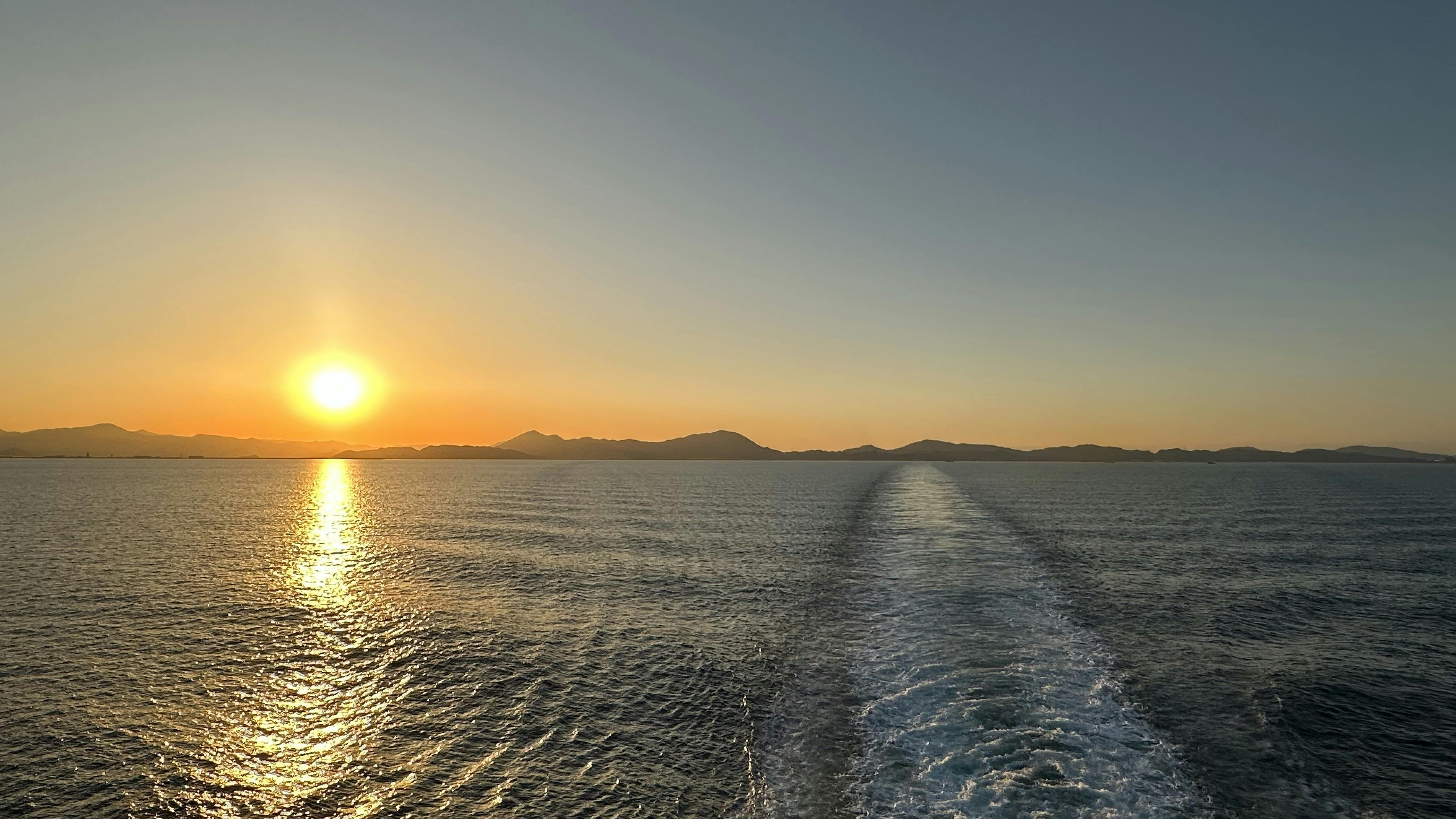 僕の顔はもういいと言う話なので、今日はフェリーから撮影した夕日です。