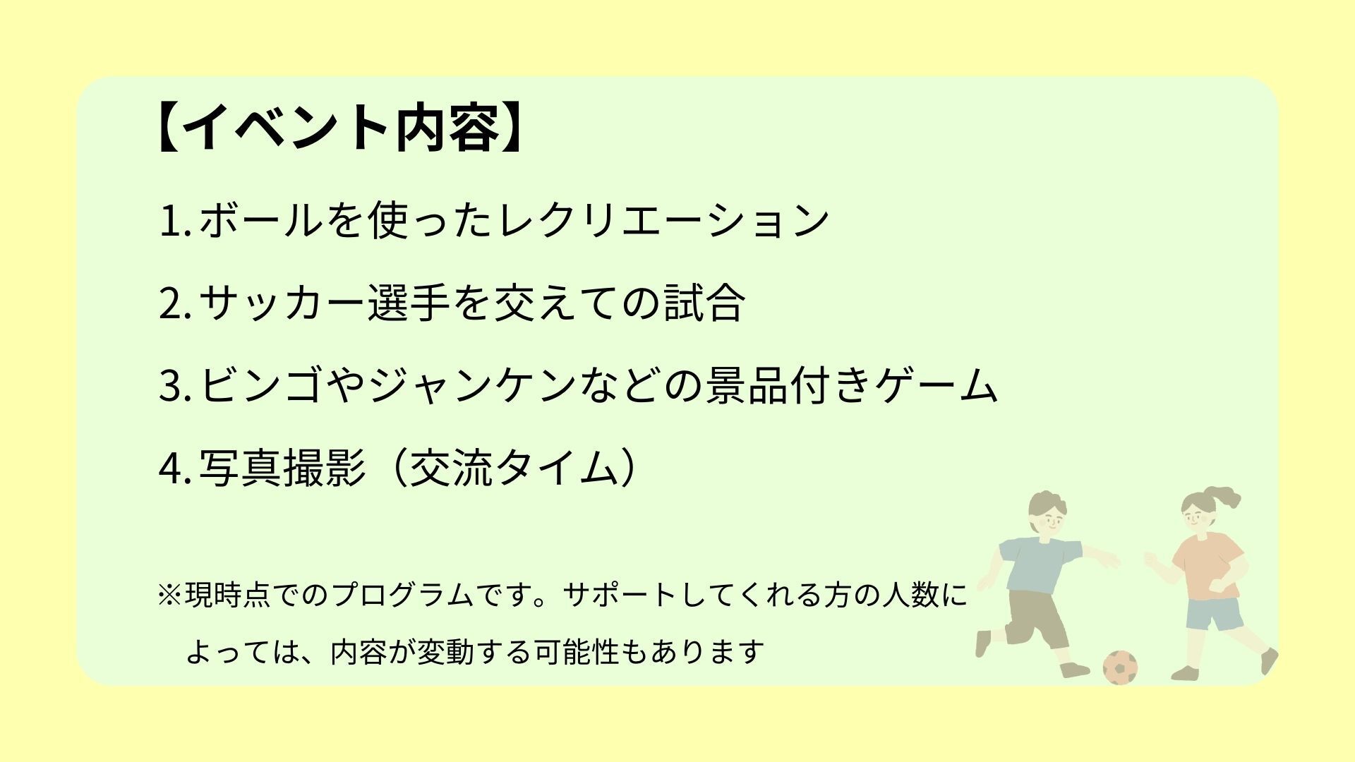 また、普段サッカーをやったことがない子も、サッカーをしている子もどちらも楽しめるようなプログラム構成にしたいと考えています。