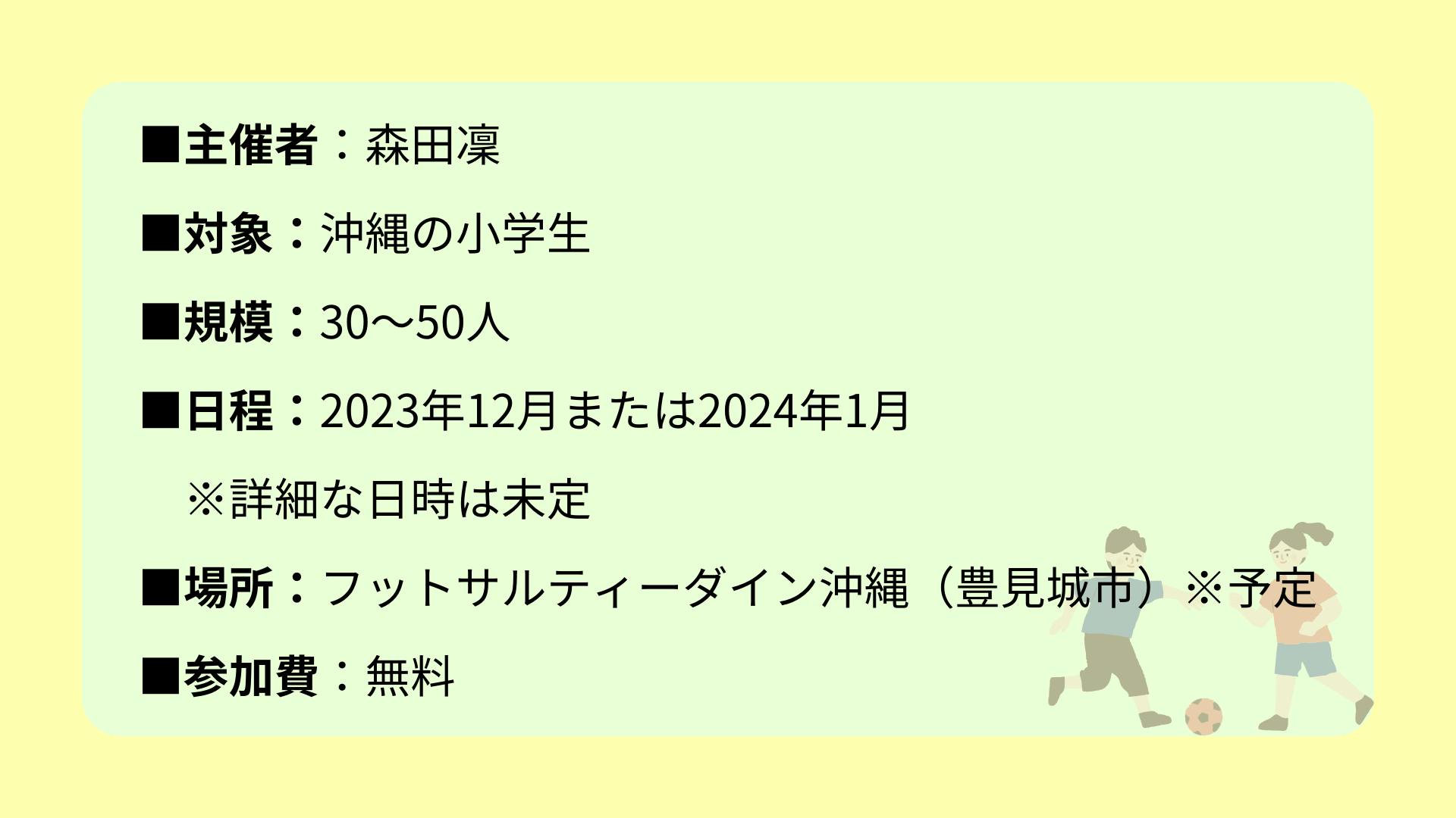 そしてこの度、沖縄で「参加費無料の子ども向けサッカーイベント」を開催することにしました。参加費を無料にしたいのは、家庭の事情に関わらずサッカーに興味がある子なら誰でも、参加してほしいからです。