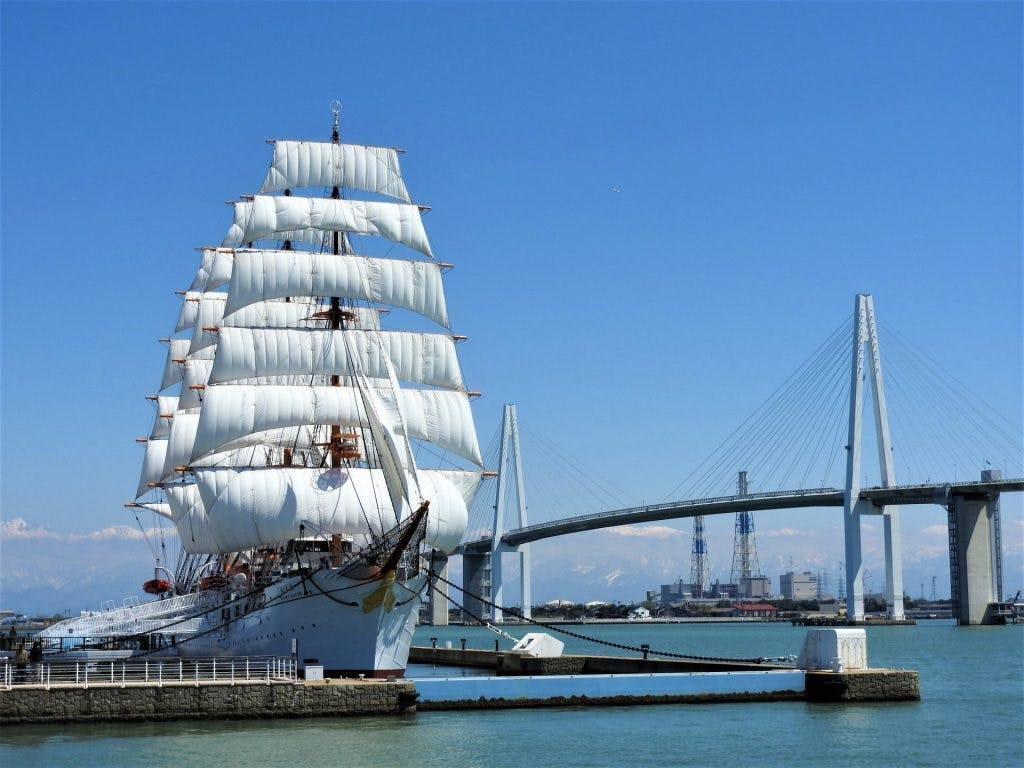 ・万葉線を海王丸駅で下車すると帆船「海王丸」の年10回しかない総帆展帆がGW中に見られます。白い船体に白い帆を広げる姿は正に白いドレスを纏った貴婦人のようです